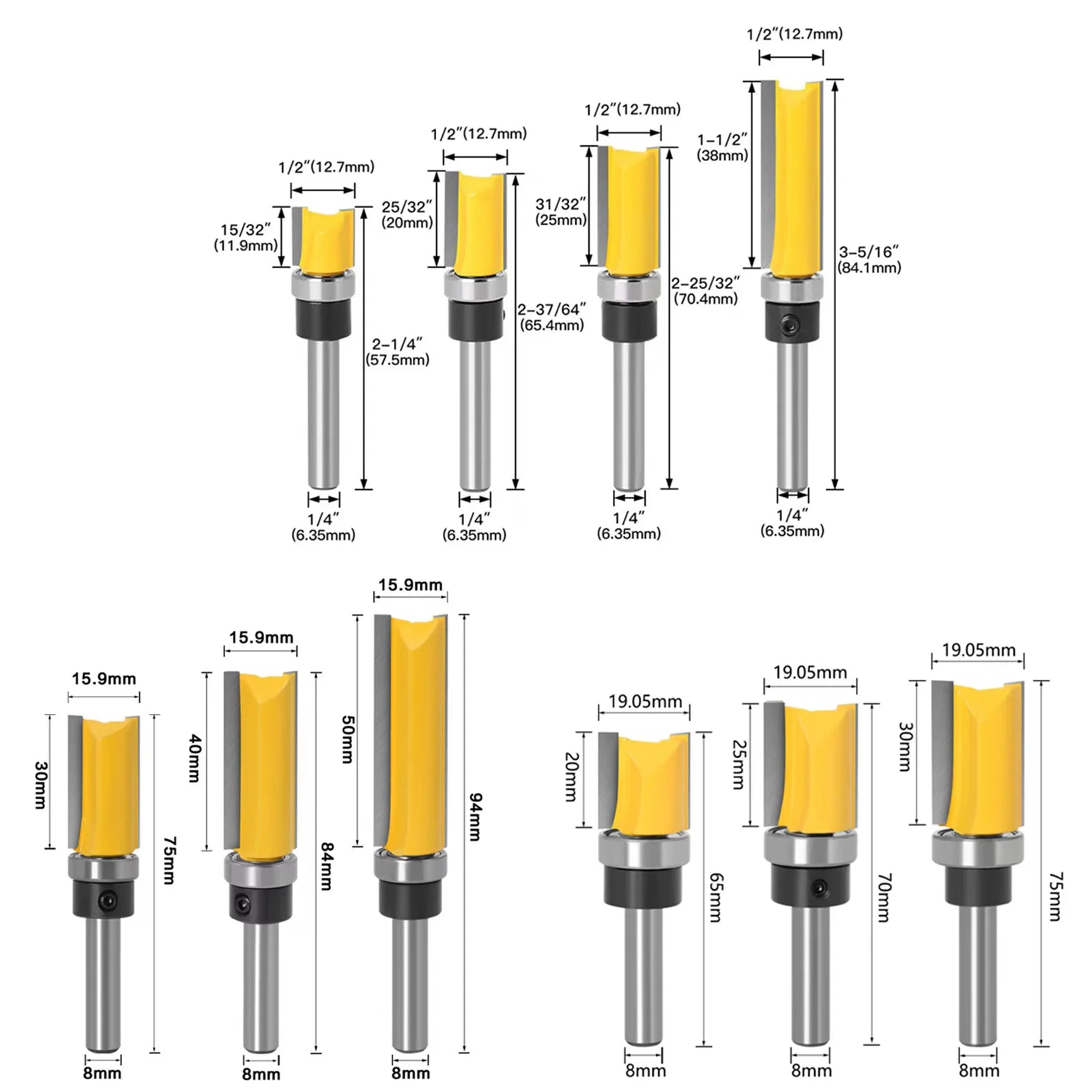 - Schaftgröße: 1/4 Zoll (8mm) für kompatible Fräsmaschinen.