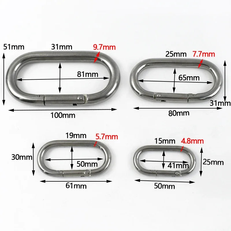Diese hochwertigen Schnallen aus Edelstahl sind ideal als Karabinerhaken, Ringhaken, Clips oder Schlüsselanhänger verwendbar. Mit ovalsicher Form und erhältlich in den Größen ID40, 50, 65 und 80 mm bieten sie vielseitige Einsatzmöglichkeiten für Taschen, Gürtel, Kleidung und Schuhe.
