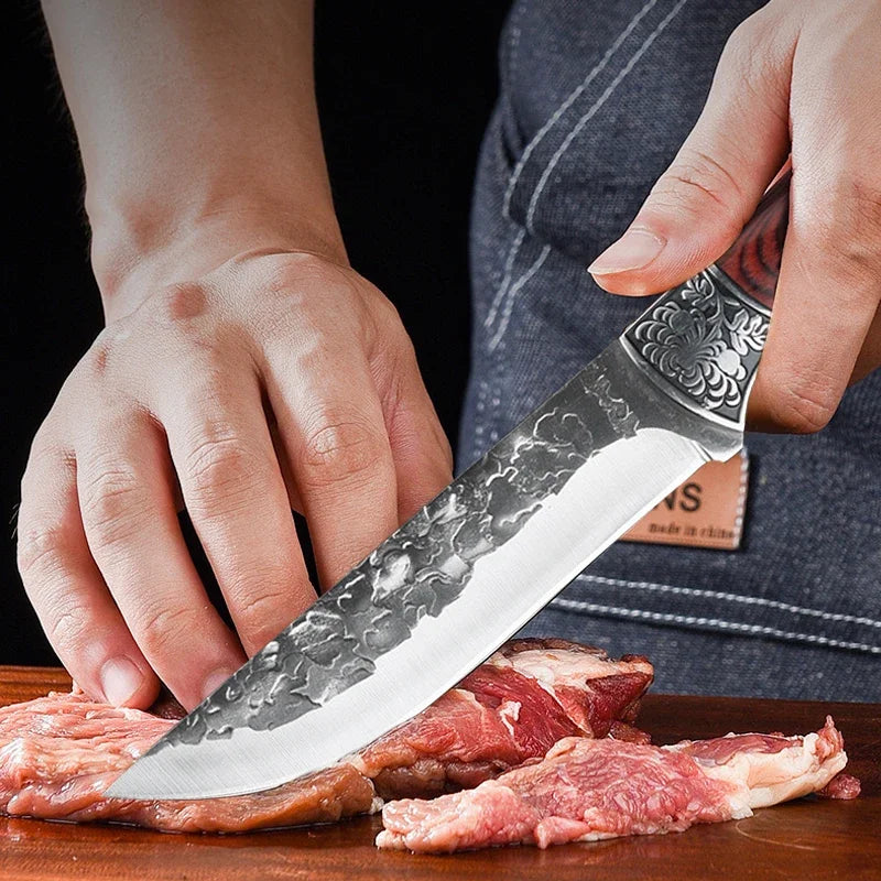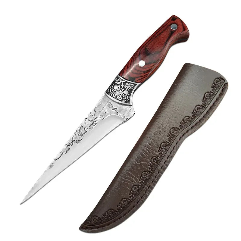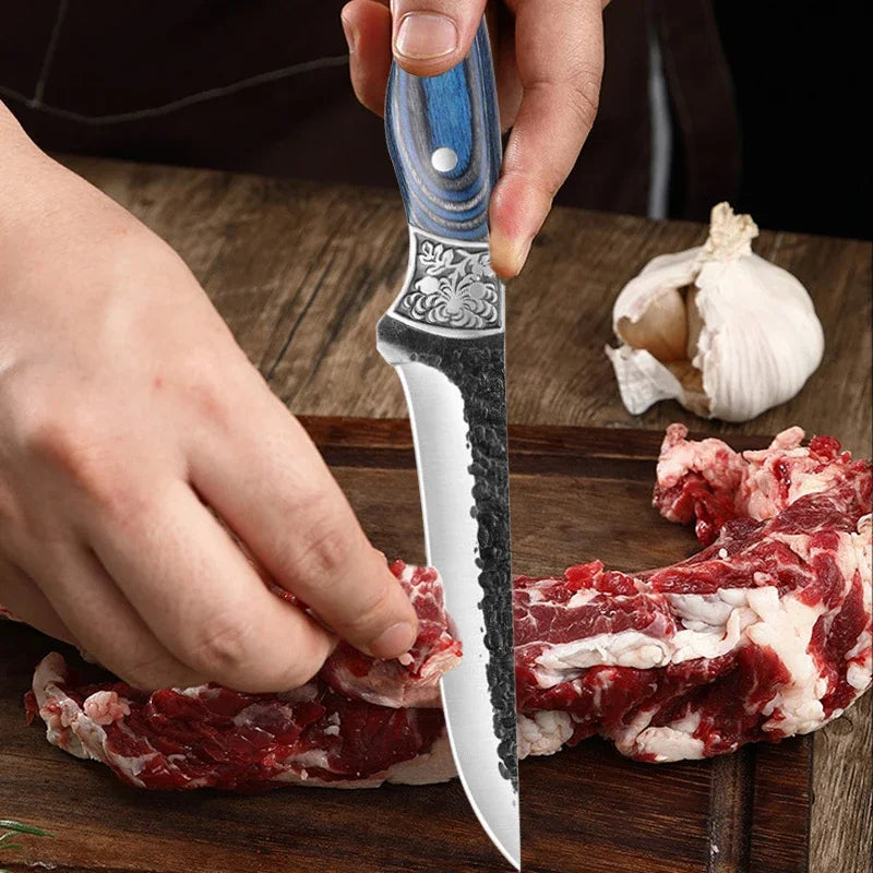 Dieses handgeschmiedete Ausbeinmesser aus rostfreiem 5Cr15 Edelstahl ist das optimale Werkzeug für präzises Schneiden, Ausbeinen und Filetieren. Ob in der Profiküche oder zuhause, es sorgt für mühelose und saubere Arbeitsabläufe.