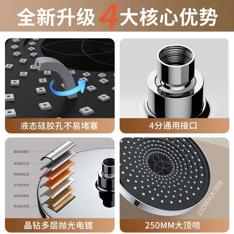 Dieses Duschkopf Set mit großem 10 Zoll Panel bietet hohen Wasserdurchfluss und eine angenehme Regenfall-Dusche. Ideal für die Deckenmontage sorgt es für ein entspannendes Duscherlebnis mit drei verschiedenen Modi zur individuellen Einstellung.