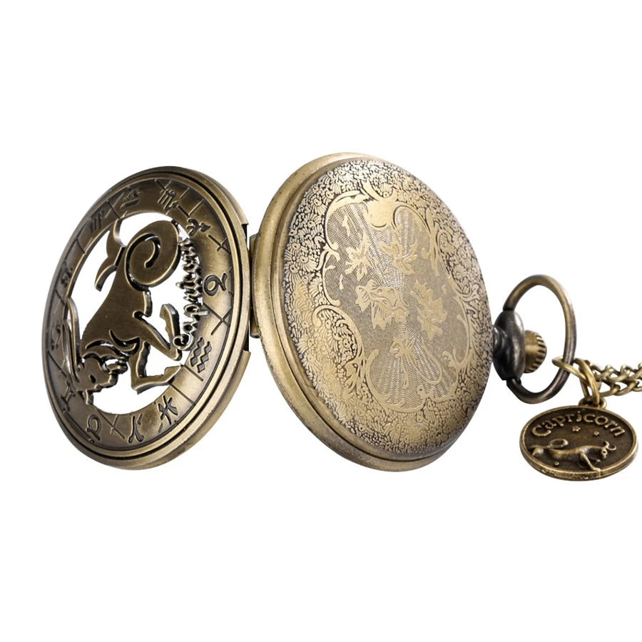 Diese Taschenuhr im Vintage-Stil zeigt das Sternzeichen Krebs als detailreiche Gestaltungselemente. Das Produkt vereint Funktionalität und Schmuckoptik, ideal für Liebhaber klassischer Uhren mit besonderem Design.