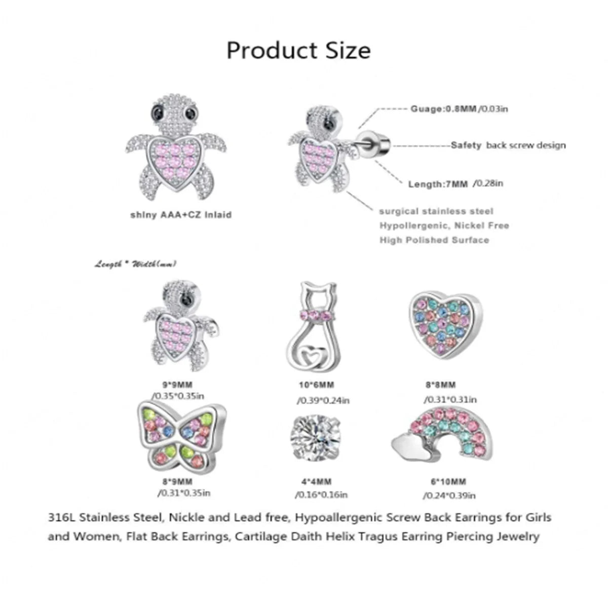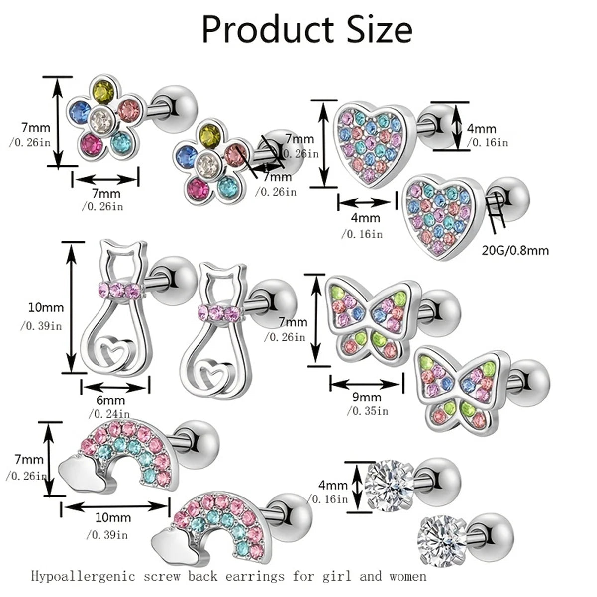 Diese modischen Schraubverschluss Ohrstecker aus 316L Edelstahl sind mit funkelndem Zirkonia verziert. Das Set enthält Motive wie Schmetterling, Herz, Regenbogen, Katze und Blume und eignet sich perfekt für Mädchen, die süßen und romantischen Schmuck lieben.