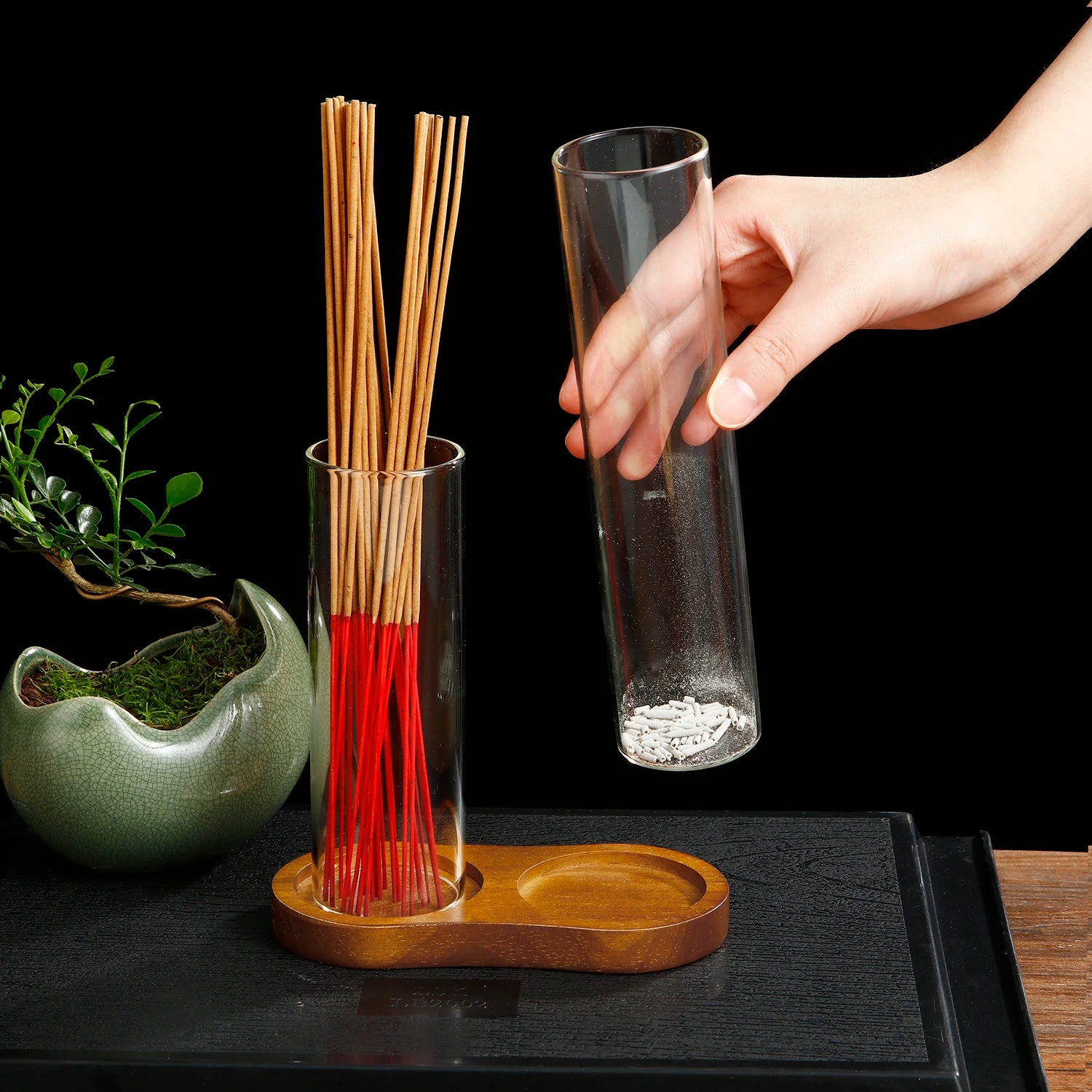 Erleben Sie mit diesem vielseitigen 2 in 1 Räucherstäbchenhalter aus Glas eine einfache und saubere Anwendung. Genießen Sie eine angenehme Atmosphäre ohne störende Ascheflug und profitieren Sie von einem integrierten Organizer für Ihre Räucherstäbchen.