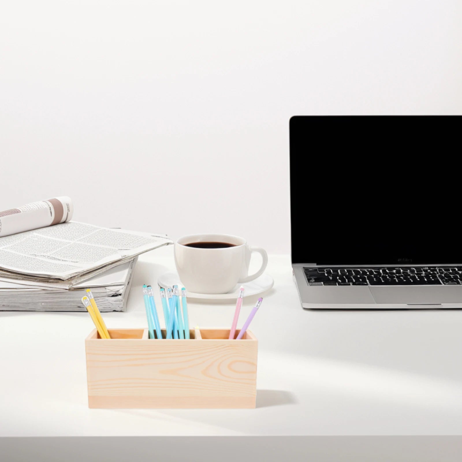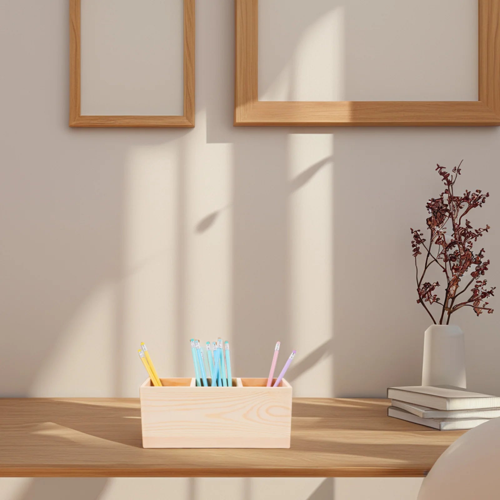 Mit diesem 3 Gitter Bleistifthalter aus Holz bringen Sie funktionale Ordnung in Ihren Arbeitsbereich. Ideal für Stifte, Make up Pinsel oder Fernbedienungen sorgt er für schnellen Zugriff und eine aufgeräumte Oberfläche. Das natürliche Material passt elegant in jedes Ambiente.