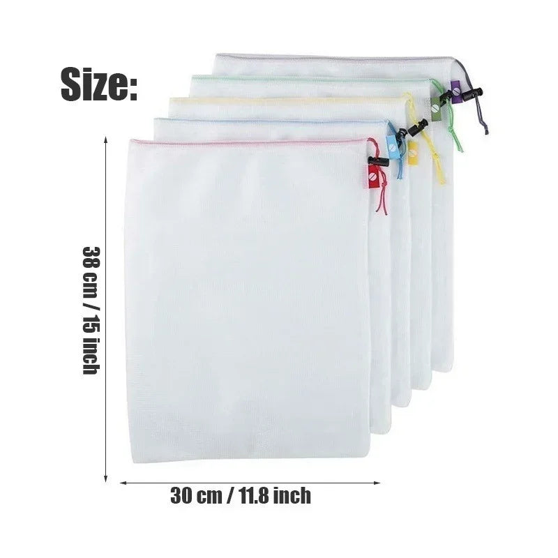 Diese 5 Stück wiederverwendbaren Netzbeutel sind ideal für die Lagerung und Organisation von Obst, Gemüse und anderen Lebensmitteln in der Küche. Das atmungsaktive Material sorgt für Frische und ist gleichzeitig umweltfreundlich und waschbar.