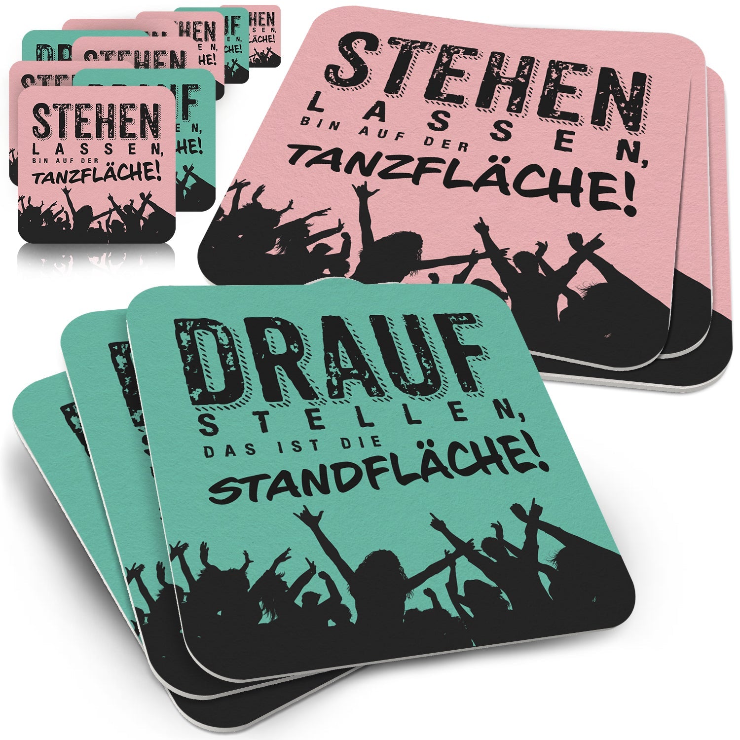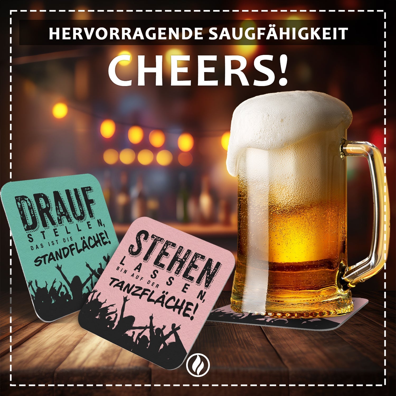 Mit diesen stylischen Bierdeckeln wird jede Feier zum unvergesslichen Ereignis. Die cleveren Sprüche "Stehen lassen bin auf der Tanzfläche" und "Draufstellen, das ist die Standfläche" sorgen für beste Stimmung und lockern die Atmosphäre spielend leicht auf. Perfekt für Geburtstage, Hochzeiten oder ausgelassene Partynächte.