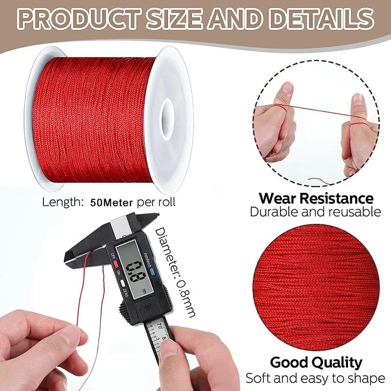 Diese 50 Meter lange Nylonschnur mit 0,8 mm Durchmesser eignet sich perfekt für kreative Projekte wie Makramee-Armbänder, Perlenarbeiten und anderen Schmuck. Das strapazierfähige Material bietet optimalen Halt und Langlebigkeit.