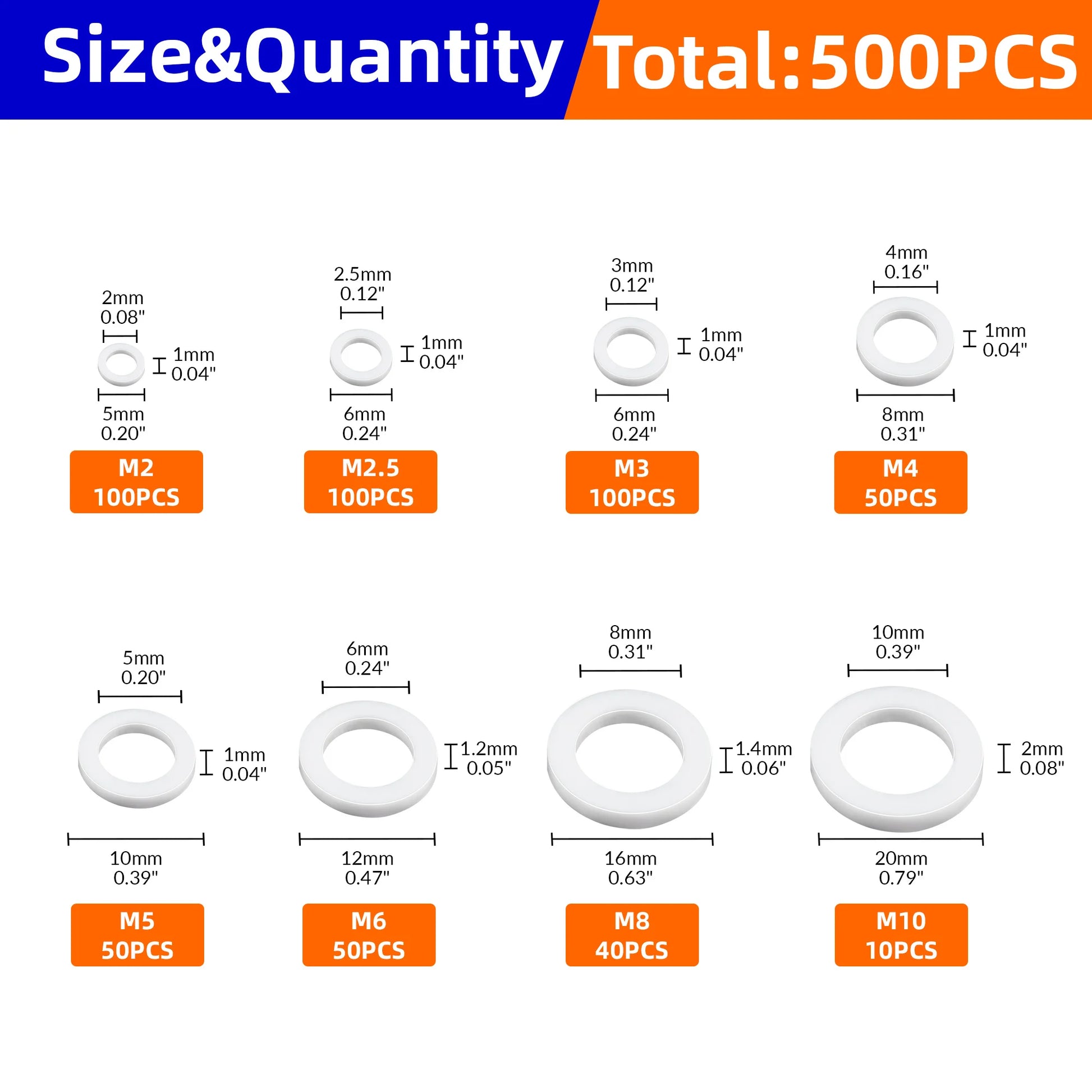 Dieses Set enthält 500 weiße Kunststoff Nylon Unterlegscheiben in verschiedenen Größen von M2 bis M10. Ideal für Metallbearbeitung und Heimwerkerprojekte bieten die Unterlegscheiben zuverlässigen Schutz und Dichtung. Das Sortiment ist vielseitig einsetzbar für Schrauben und Muttern, um Stabilität und Langlebigkeit zu gewährleisten.