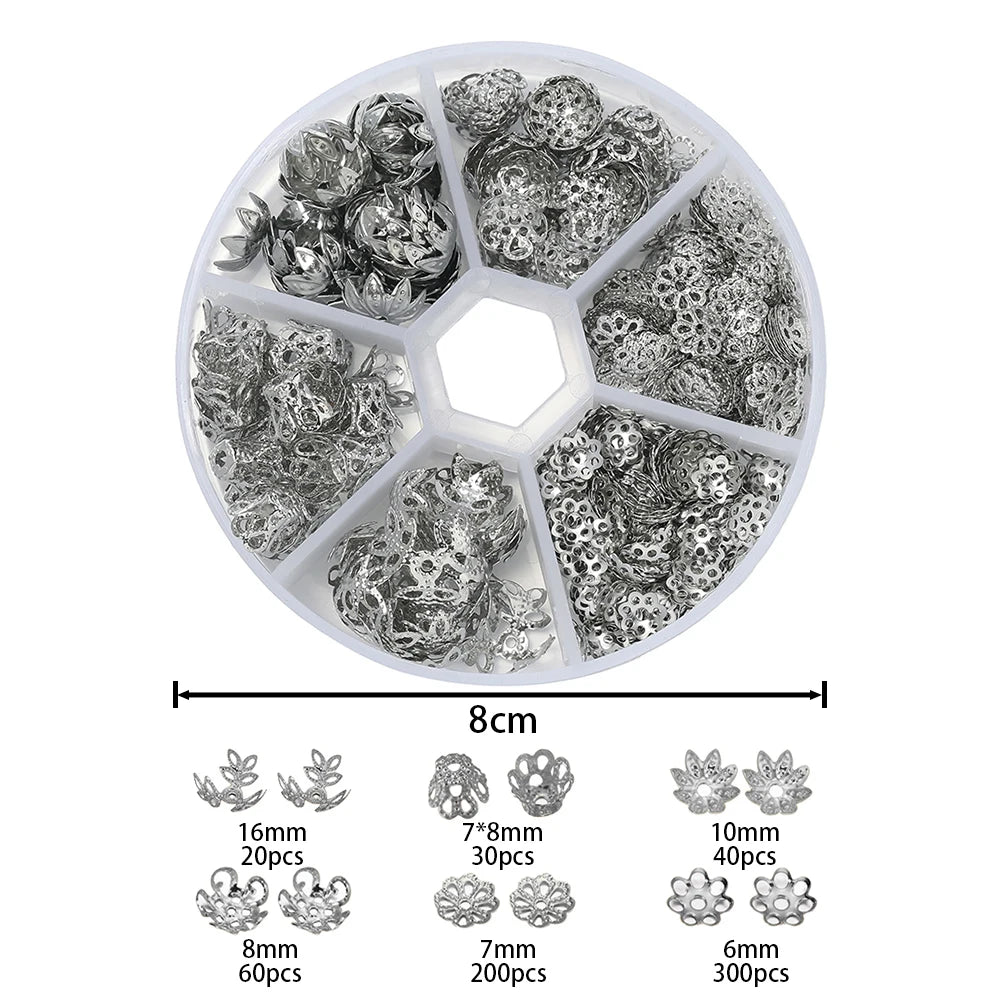 Dieses umfangreiche Schmuckset enthält 650 Teile mit sechs verschiedenen Stilen von Blumenperlen, Endkappen und Quasten. Es eignet sich perfekt zum Basteln von Halsketten, Armbändern, Ohrringen und Ringen. Ideal für alle, die individuellen Schmuck selbst gestalten möchten.
