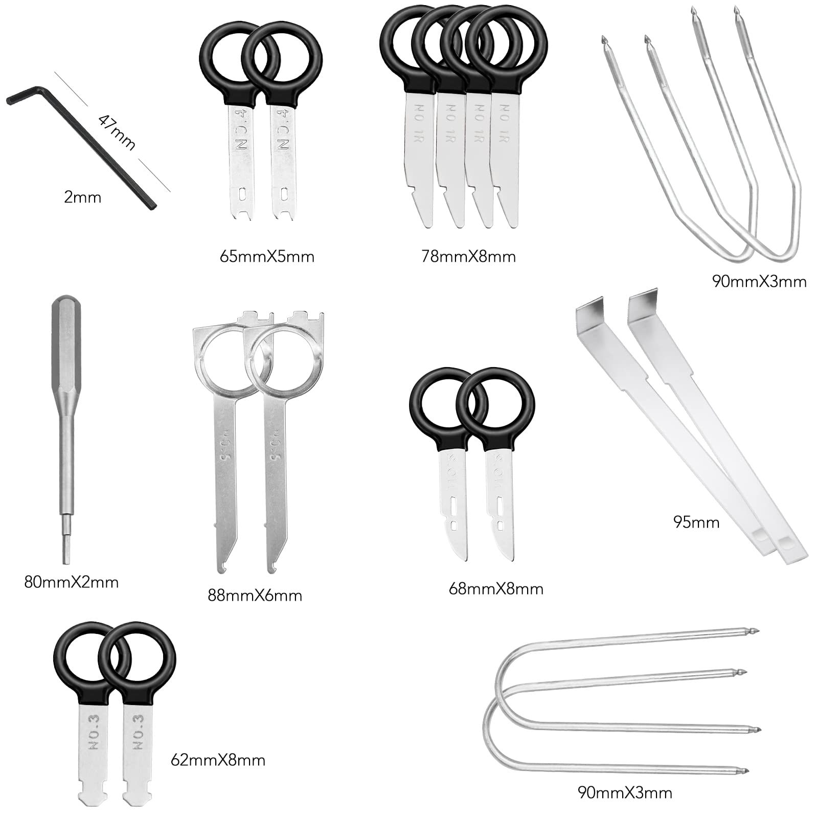 Das Set umfasst 20 hochwertige Werkzeuge, die speziell fuer die Anforderungen verschiedenster Fahrzeugmodelle konzipiert wurden. Gefertigt aus robustem Edelstahl, sind die Werkzeuge langlebig und widerstandsfaehig gegen Verschleiss. Die durchdachte Konstruktion ermoeglicht ein mueheloses Entfernen der Einheit ohne Kratzer oder andere Beschadigungen an Radio oder Armaturenbrett. Es ist ein unverzichtbarer Helfer fuer jeden, der an seinem Fahrzeug arbeitet.Technische Daten