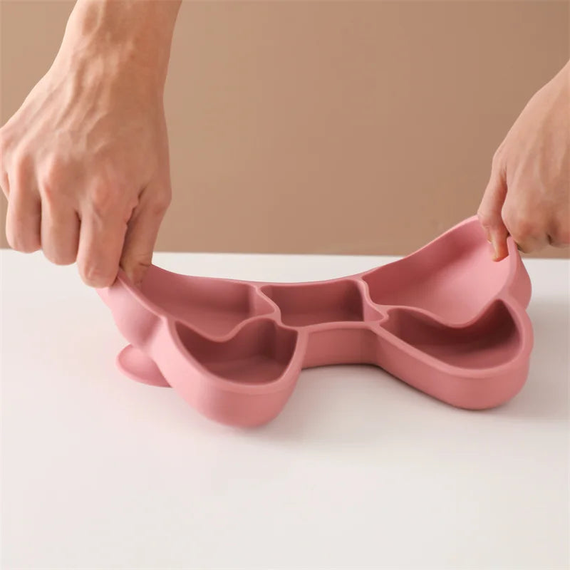 Dieses Babygeschirr Set besteht aus einer rutschfesten Silikonplatte in Bowknot-Form, einem Löffel und einer Gabel. Das Set ist aus lebensmittelechtem, BPA-freiem Silikon gefertigt und eignet sich ideal für Babys im Alter von 0 bis 1 Jahr. Das niedliche Cartoon-Bären-Design macht jede Mahlzeit zum Vergnügen.