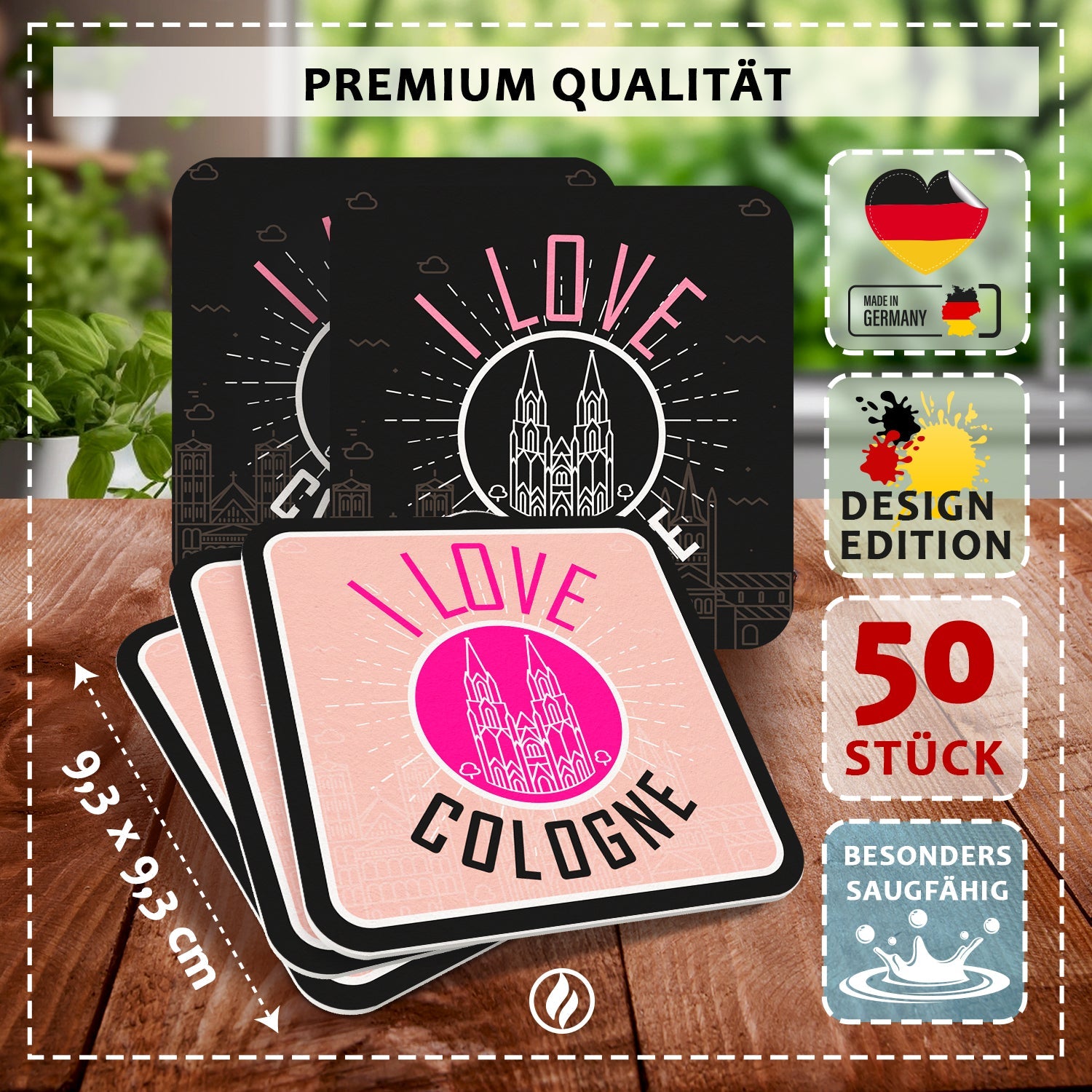 Jeder Bierdeckel ist mit Hingabe gestaltet und präsentiert stolz das Bild des Kölner Doms, eingefasst von der warmherzigen Botschaft "I Love Cologne".