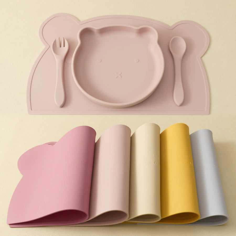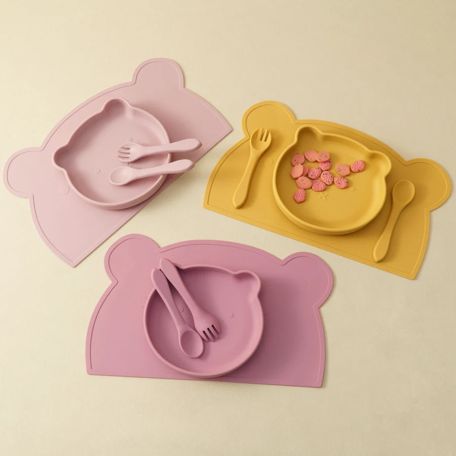 Dieses Set aus BPA-freiem Silikon umfasst Teller, Löffel, Gabel und ein Tischset, ideal für die Baby- und Kleinkindernährung. Das weiche, sichere Material ist für Kinder von 0 bis 6 Jahren geeignet und zeichnet sich durch seine Langlebigkeit und einfache Reinigung aus.