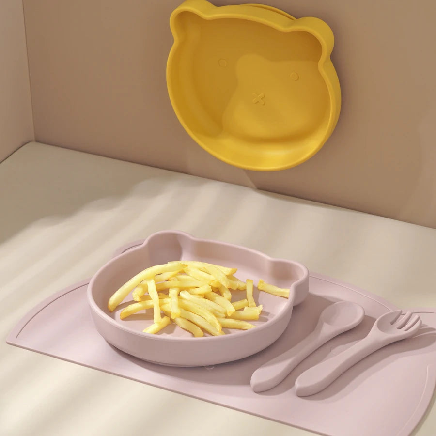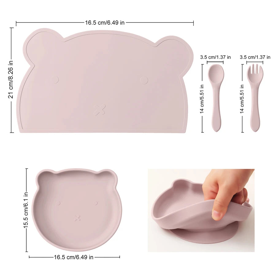 4-teiliges BPA-freies Silikon Kinder Geschirr Set mit Teller Löffel Gabel