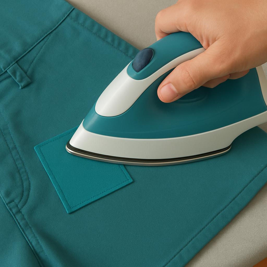 Das Bügeleisen auf „Baumwolle / Stufe 3“ vorheizen (kein Dampf verwenden). Den Flicken mit der beschichteten Seite nach unten auf die beschädigte Stelle legen. Mit Druck ca. 30 Sekunden bügeln. Danach abkühlen lassen. Für stark beanspruchte Stellen kann eine zusätzliche Fixierung durch Annähen sinnvoll sein.
