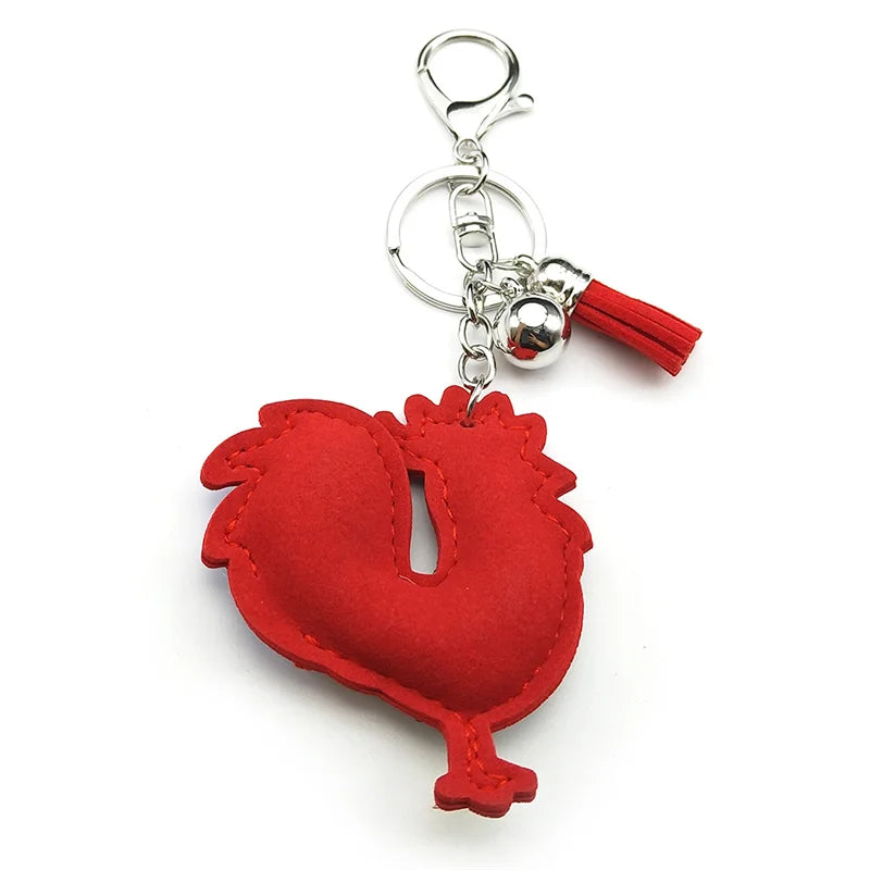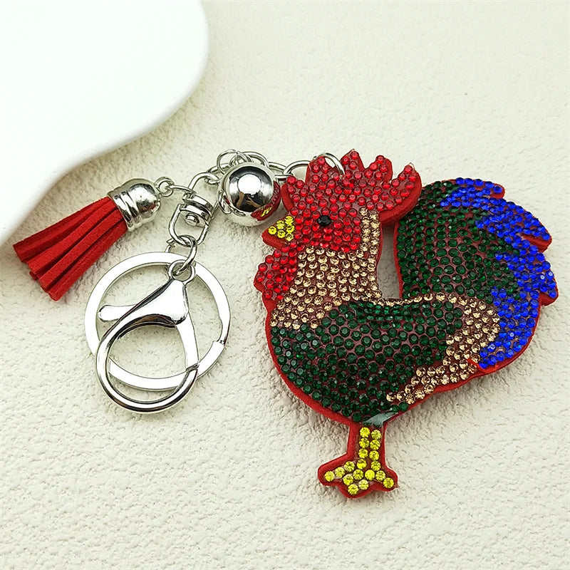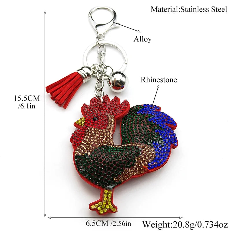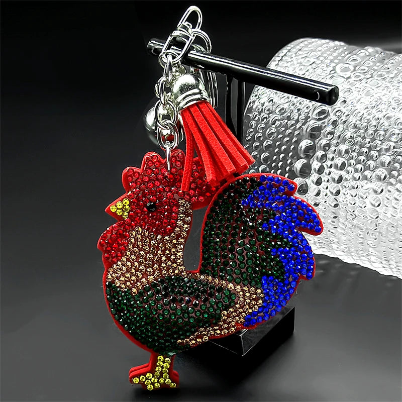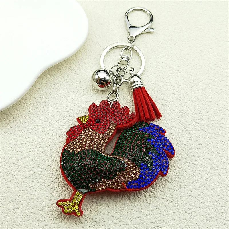 Dieser auffällige Schlüsselanhänger in Form eines Hahns kombiniert farbenfrohe Kristalle mit robustem Leder und metallischen Elementen in Silberfarbe. Ideal für Frauen und Männer, die ein modisches Accessoire für Schlüssel, Taschen oder Autoschmuck suchen.