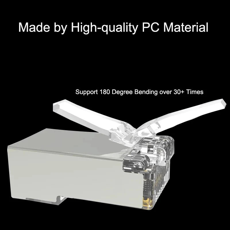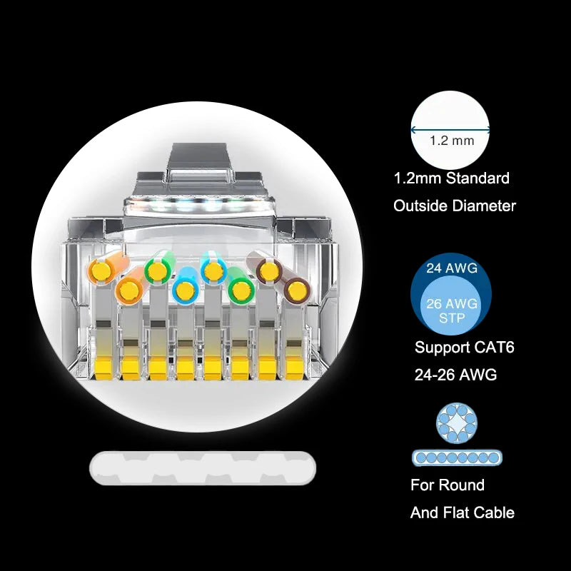 - Einfaches Pass-Through-Design: Ermöglicht ein schnelleres und fehlerfreieres Crimpen, da die Adern komplett durch den Stecker geführt und dann bündig abgeschnitten werden.