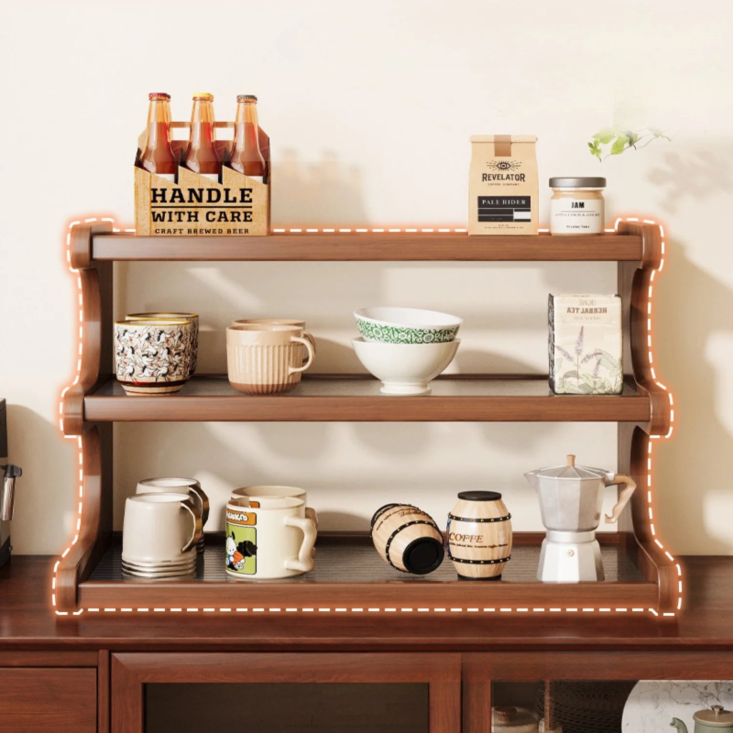 Dieses mehrstufige Aufbewahrungsregal aus Holz bringt Ordnung und Stil in Ihren Alltag. Egal ob Kaffeetassen, Teekannen oder Gewürze – hier findet alles seinen Platz. Das natürliche Material sorgt für eine angenehme Atmosphäre bei Ihnen zu Hause.