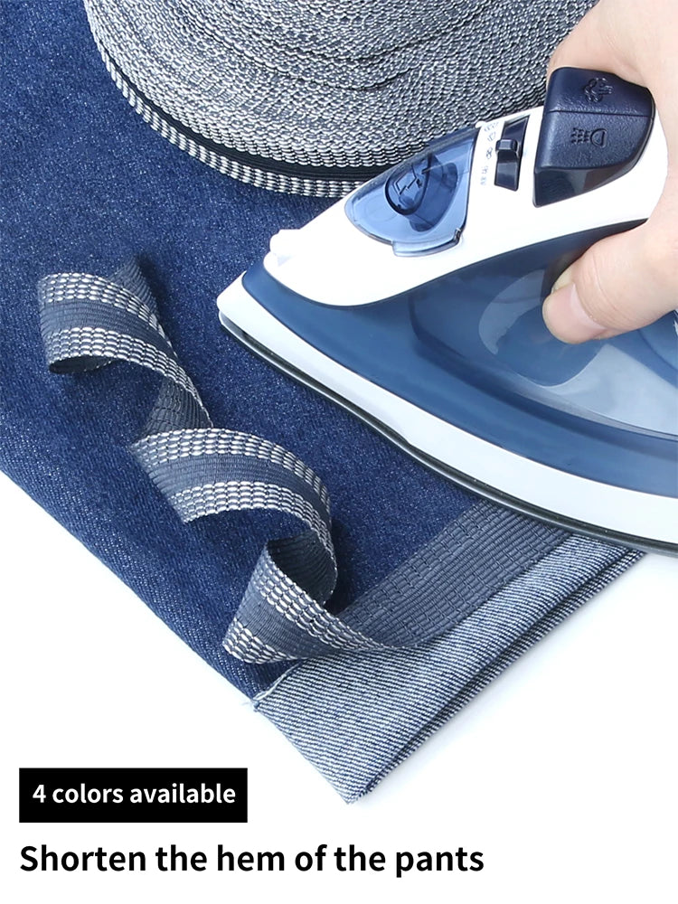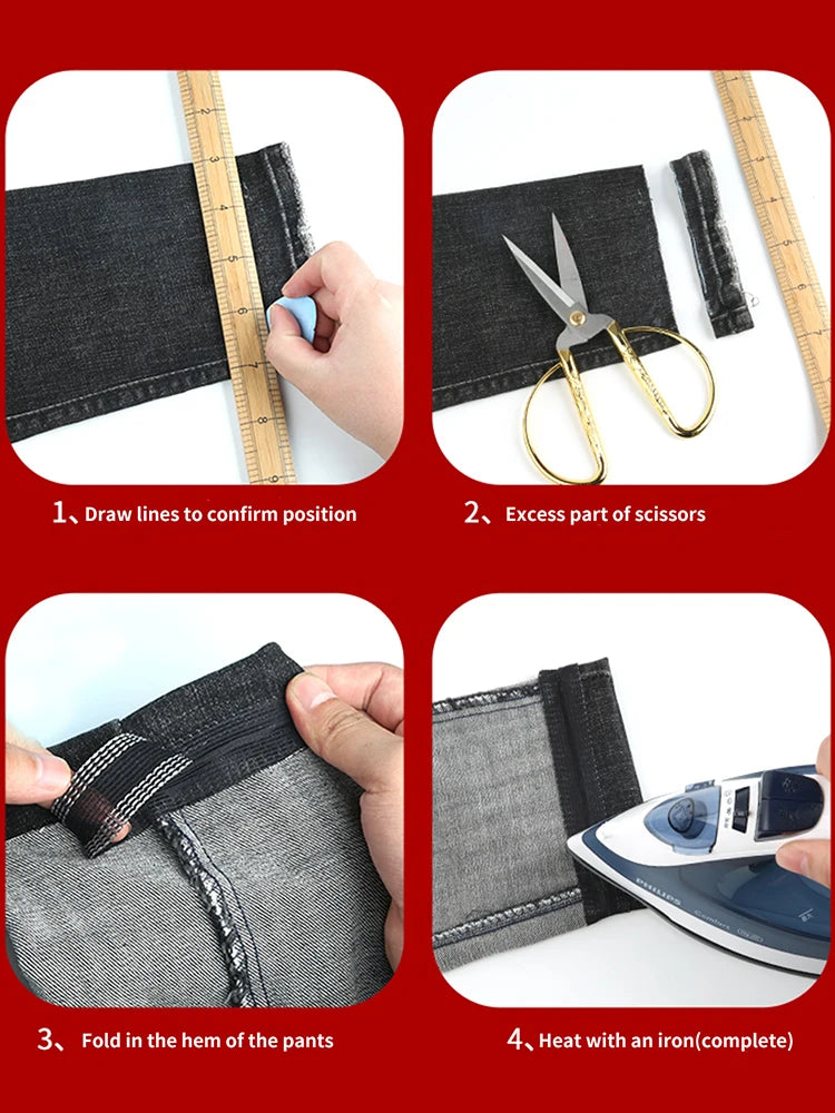 Diese selbstklebende Hosen-Paste ermöglicht Ihnen, Ränder einfach und schnell mit einem Bügeleisen zu reparieren oder zu kürzen. Ideal für Jeans, Hosen und andere Kleidungsstücke bietet das Patch eine praktische Lösung ohne Nähen.