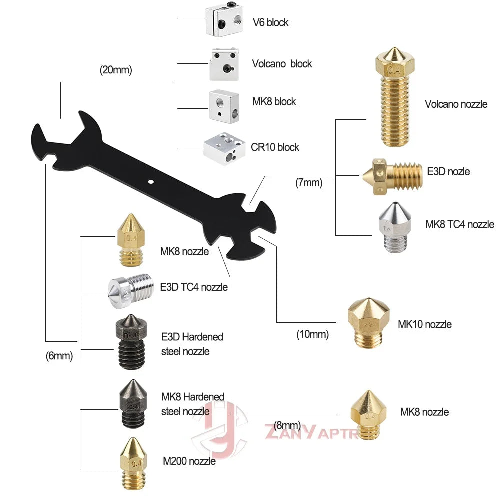 Dieser vielseitige 5-in-1 Drehschlüssel ist speziell für den präzisen Einsatz an Düsen von 3D-Druckern konzipiert. Gefertigt aus robustem Edelstahl, überzeugt das Werkzeug durch seine Langlebigkeit und korrosionsbeständige Oberfläche.