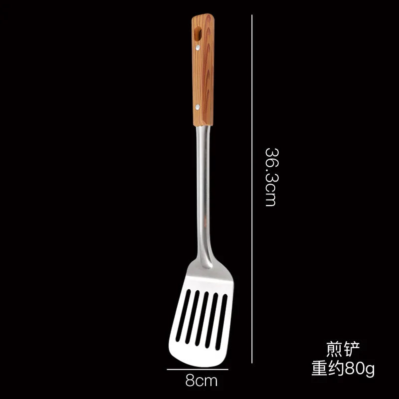 Küchengeschirr Set aus Edelstahl mit Holzmaserung Griff