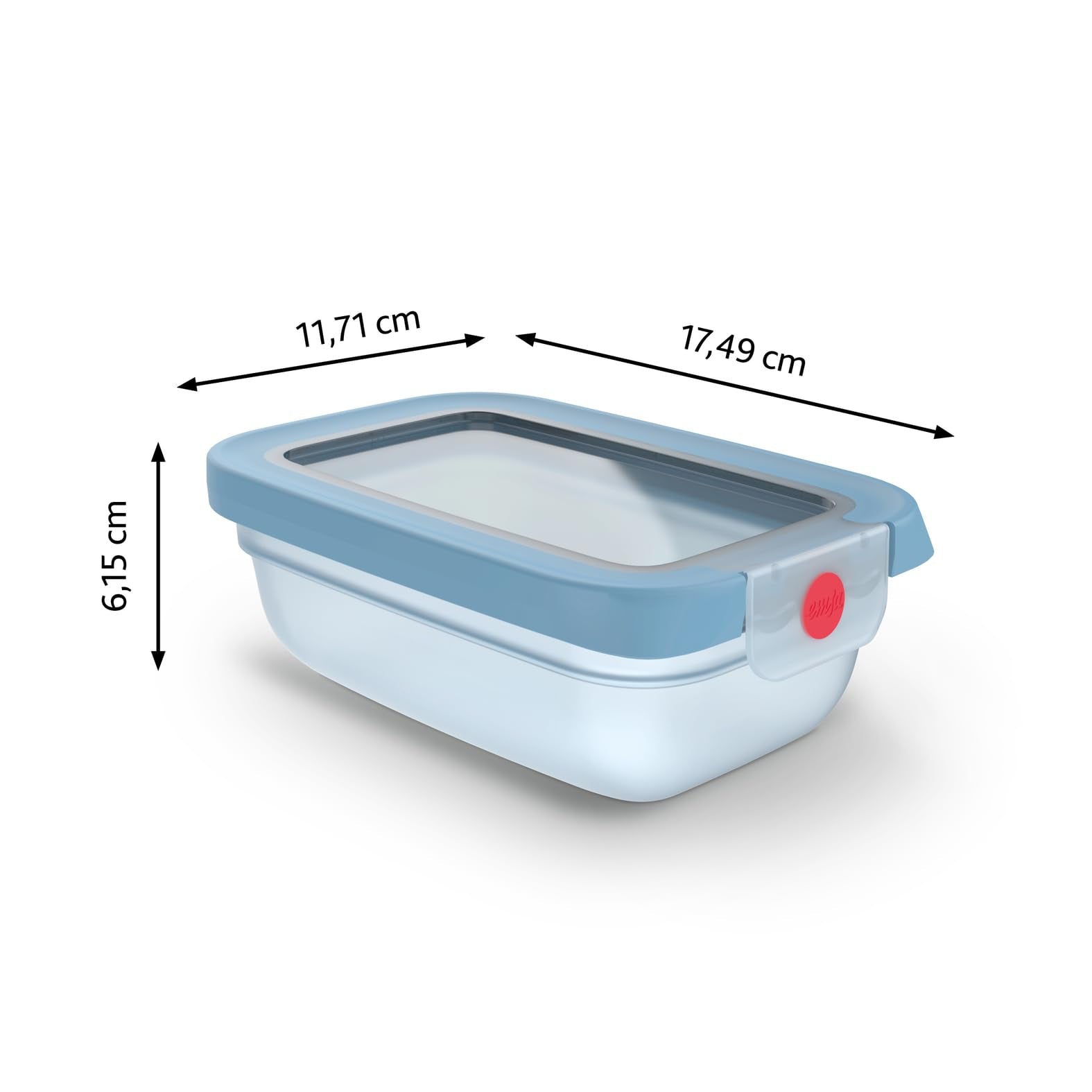 - Farbe & Design: Klare Dose mit blauem Deckel, modernes funktionales Design ermöglicht einfaches Stapeln und platzsparendes Ineinanderstapeln unterschiedlicher Größen.
