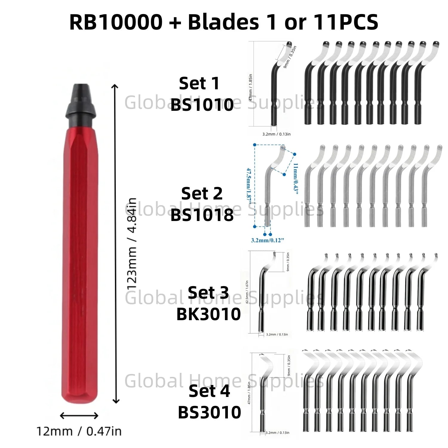 Das RB1000 Entgratungswerkzeug Set enthält 1 oder 11 Schnellarbeitsstahl-Schwenkklingen (BS1010, BS1018, BK3010, BS3010) für effizientes Entfernen von Graten. Ideal für die Bearbeitung von Kanten in verschiedensten Materialien.