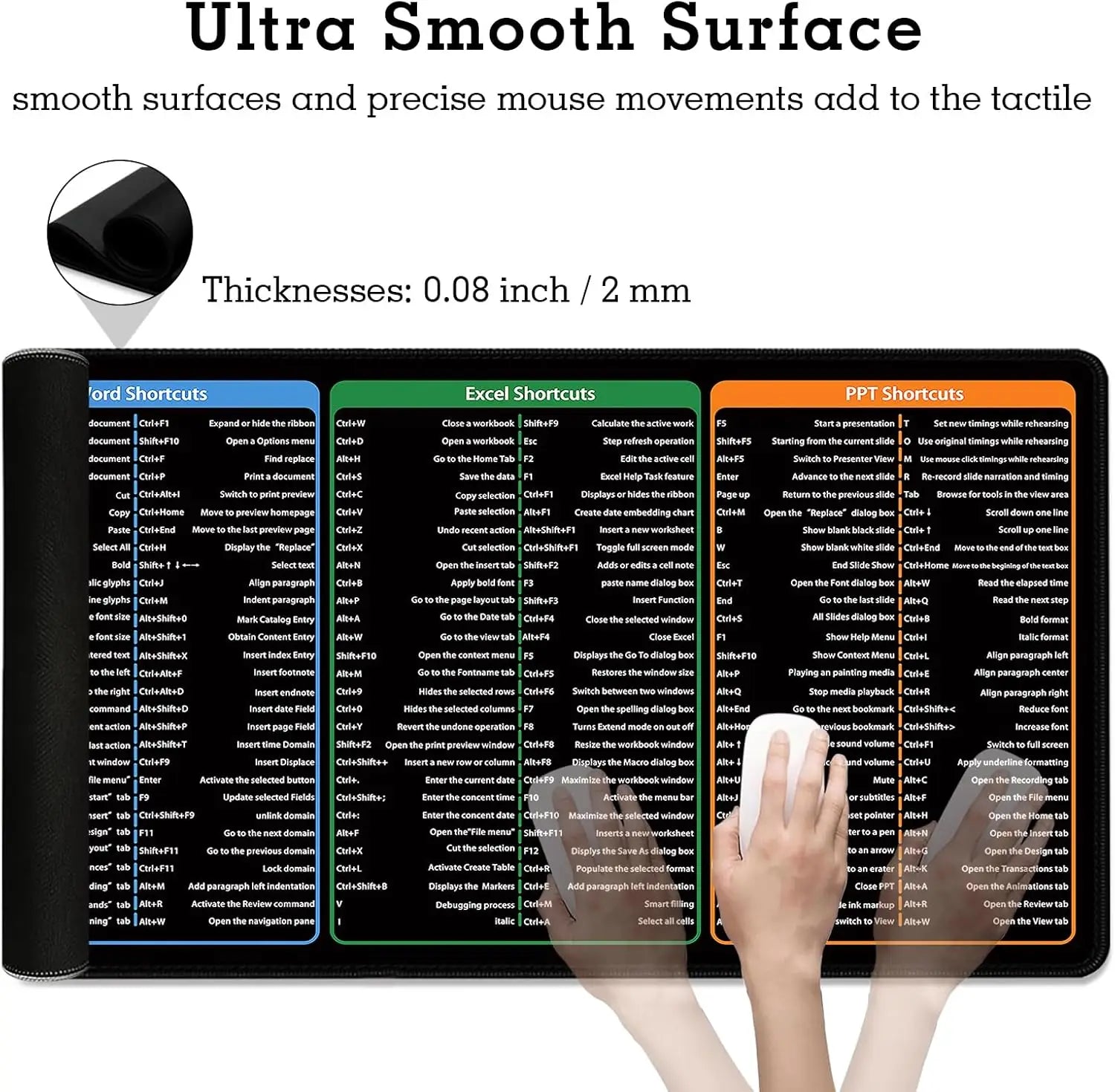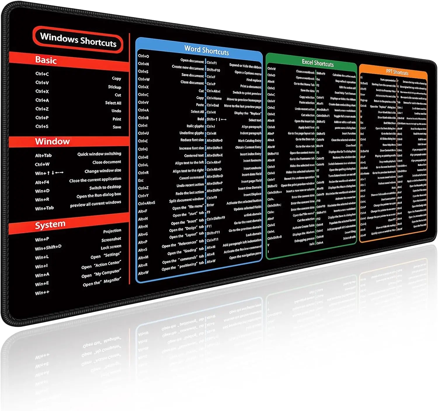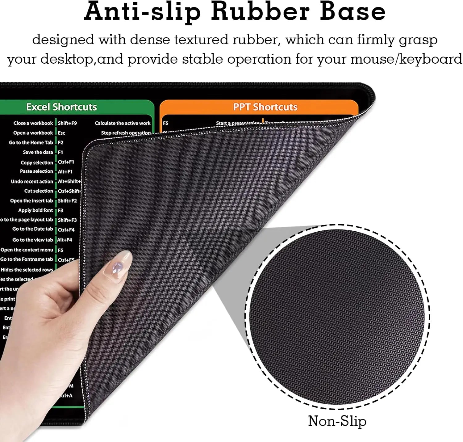 Dieses extra große, rutschfeste Schreibtisch-Mauspad kombiniert Komfort am Arbeitsplatz mit nützlichen Spickzettel-Informationen zu Excel, Word, Windows und PowerPoint. Perfekt für schnellen Zugriff bei der Arbeit am Computer.