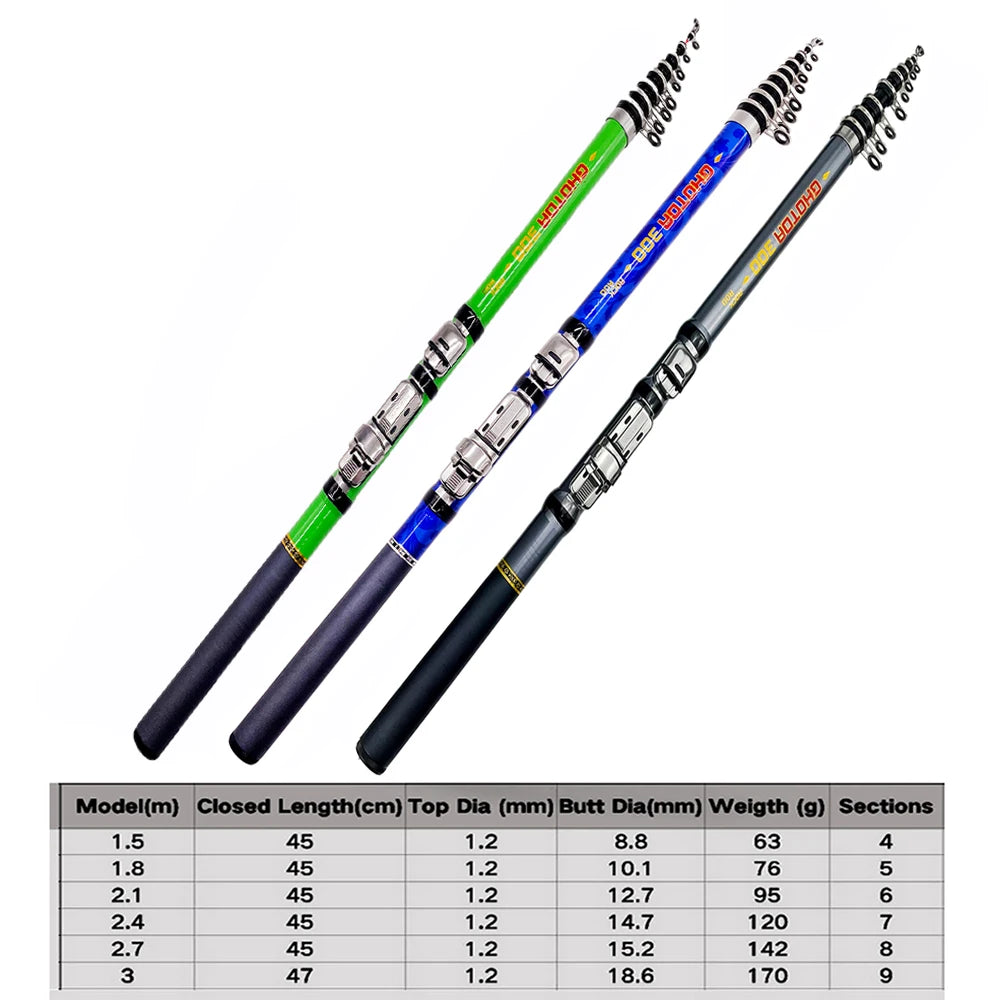 Diese leichte und robuste Teleskop Angelrute aus Carbon ist perfekt geeignet für das Angeln am Meer, an Felsen sowie in Seen und Flüssen. Mit Längen von 1,5 bis 3,0 Metern und einer Tragkraft von 1 bis 6 Pfund ist die Rute vielseitig einsetzbar und ideal für Angler, die Flexibilität und Präzision schätzen.