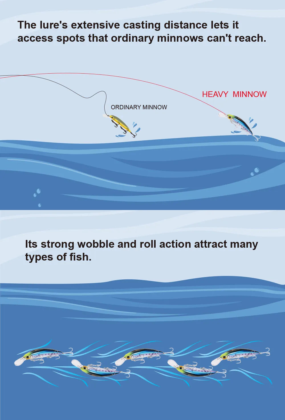 Entdecken Sie den schweren sinkenden Minnow Angelköder, ideal für den Einsatz in Salzwasser und Süßwasser. Dieses robuste Modell sorgt für weite Würfe und eine realistische Köderbewegung, die Fische zum Anbiss lockt.
