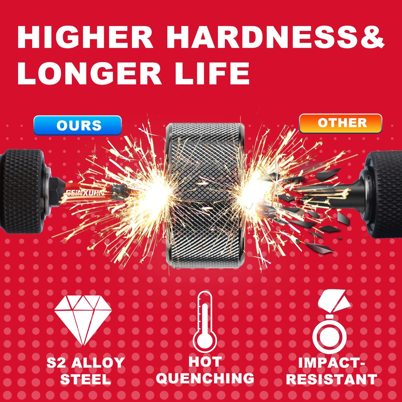 - Stoßfest & langlebig: Durch strenge Wärmebehandlung ist jeder Bit extrem widerstandsfähig gegen Abnutzung.