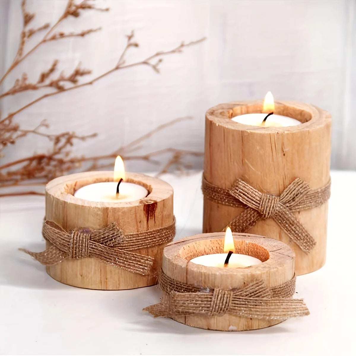 Handgefertigte Kerzenhalter aus poliertem Holz 3er Set Rustikal S