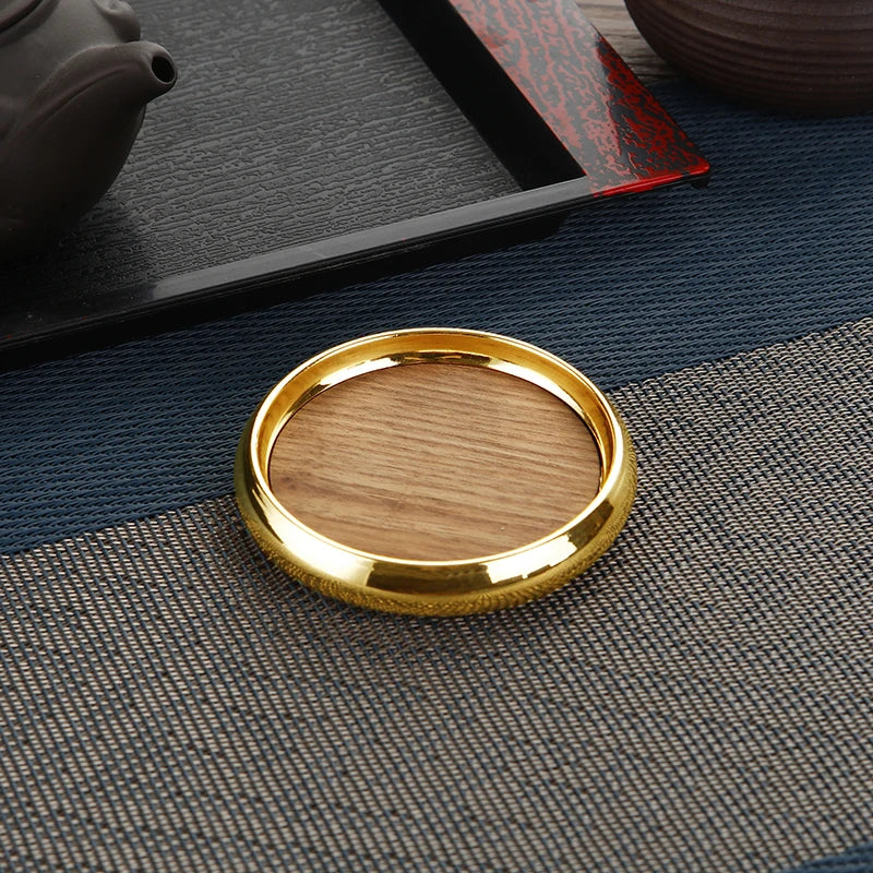 Dieser runde Untersetzer aus Holz mit Metallring schützt Ihre Oberflächen vor Hitze und Feuchtigkeit. Ideal für Tee, Kaffee und andere Getränke auf jedem Tisch.