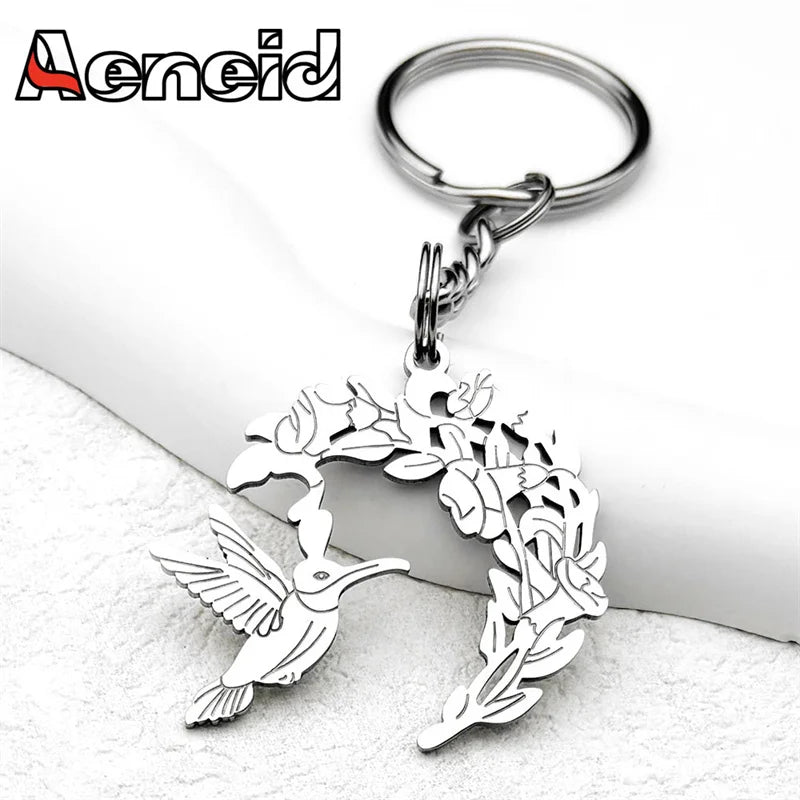 Eleganter Kolibri-Blumen-Schlüsselanhänger aus Edelstahl