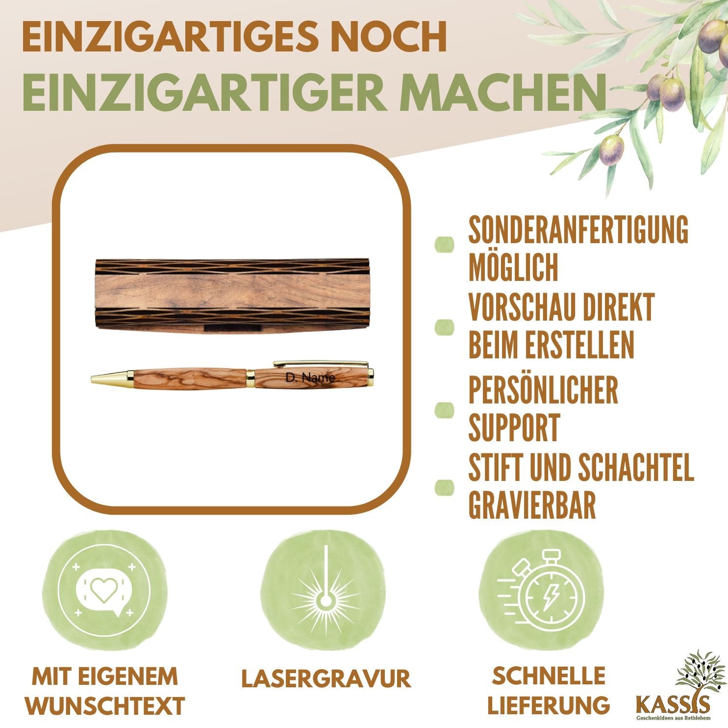 - Einzigartige Maserung: Handverlesenes Olivenholz macht jeden Kugelschreiber zu einem besonderen Einzelstück.
