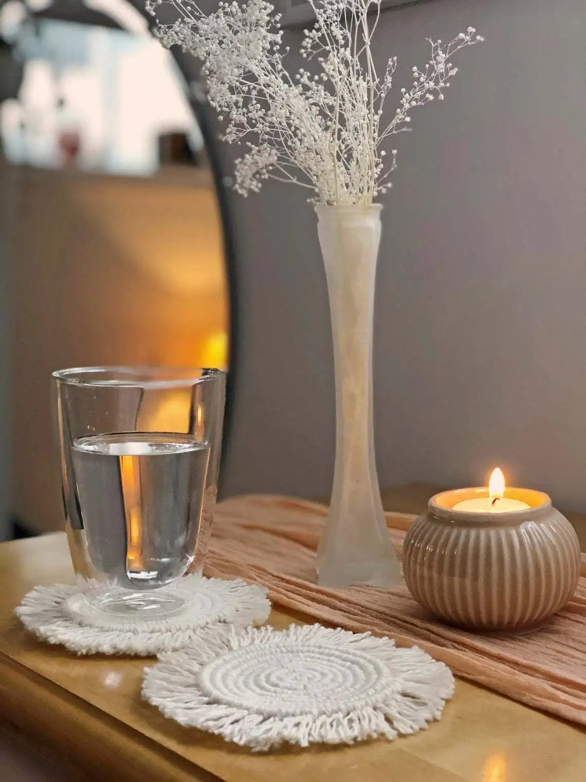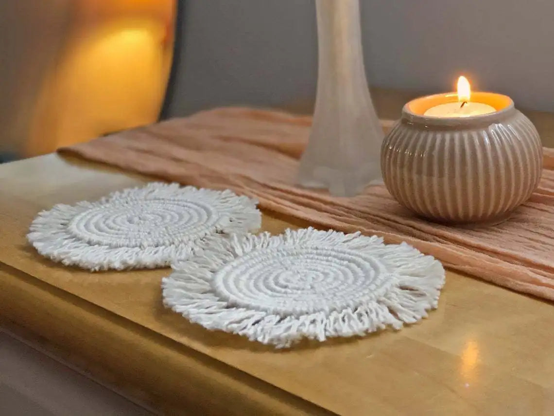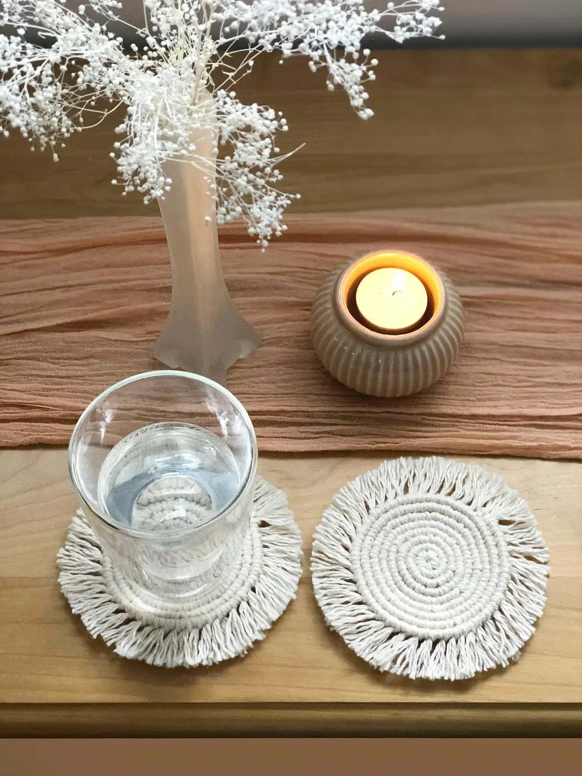Unsere Makramee Tischsets sind in der auf den Produktbildern gezeigten Ausfuehrung erhaeltlich. Bitte beachten Sie die Produktbilder fuer die genaue Darstellung der Farben und Designs. Die natuerliche Beschaffenheit des Materials kann zu geringfuegigen Abweichungen fuehren, die den einzigartigen Charakter jedes Stueckes unterstreichen.