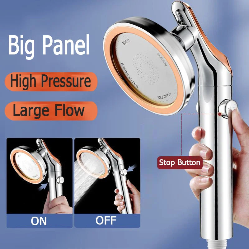 Diese Handbrause mit großem rundem Panel verbindet hohen Wasserdruck mit einer praktischen Stopptaste zur Wasserersparnis. Ideal für Badezimmer und ermöglicht ein angenehmes Duscherlebnis bei reduziertem Verbrauch.