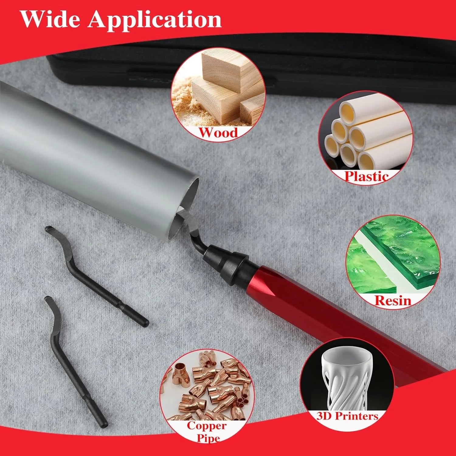 - Einsatzgebiete: Metall, Harz, Kunststoff, PVC und 3D-gedruckte Objekte