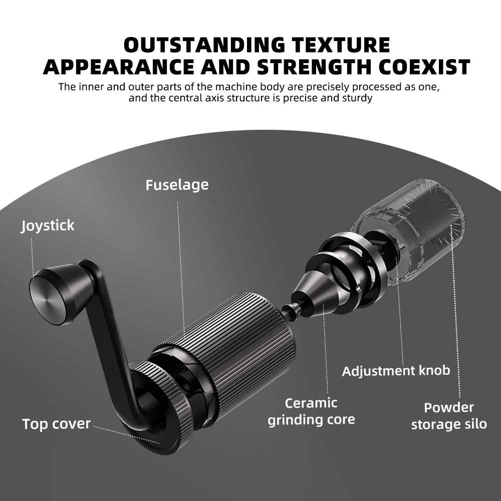 Genießen Sie frisch gemahlenen Kaffee jederzeit mit dieser tragbaren Mini-Kaffeebohnenmühle. Sie verfügt über ein konisches Mahlwerk und eine manuelle Handkurbel mit individuell einstellbarem Mahlgrad.