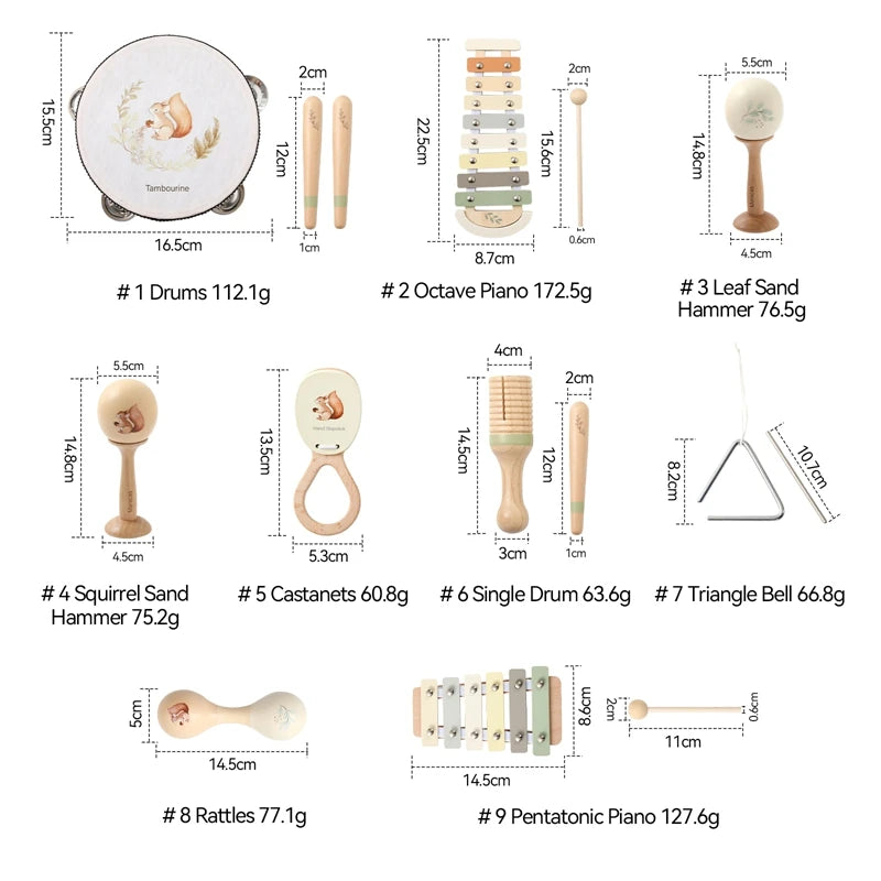 Mit diesen Montessori Musikinstrumenten aus Holz können Babys und Kleinkinder die Welt der Klänge auf natürliche und sichere Weise erforschen. Das harmonische Design und die sorgfältige Verarbeitung machen jedes Instrument zu einem idealen Begleiter für kleine Entdecker.