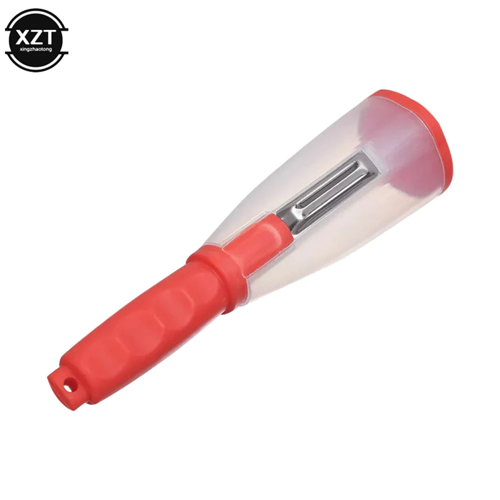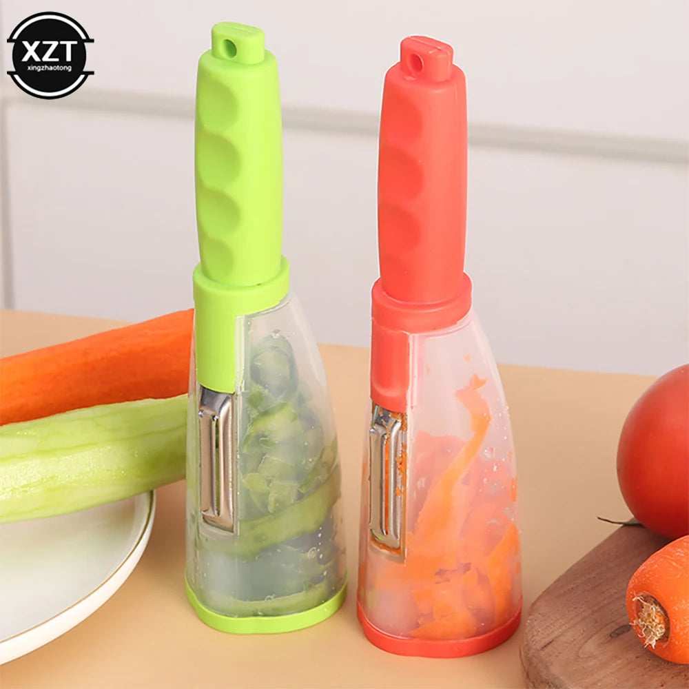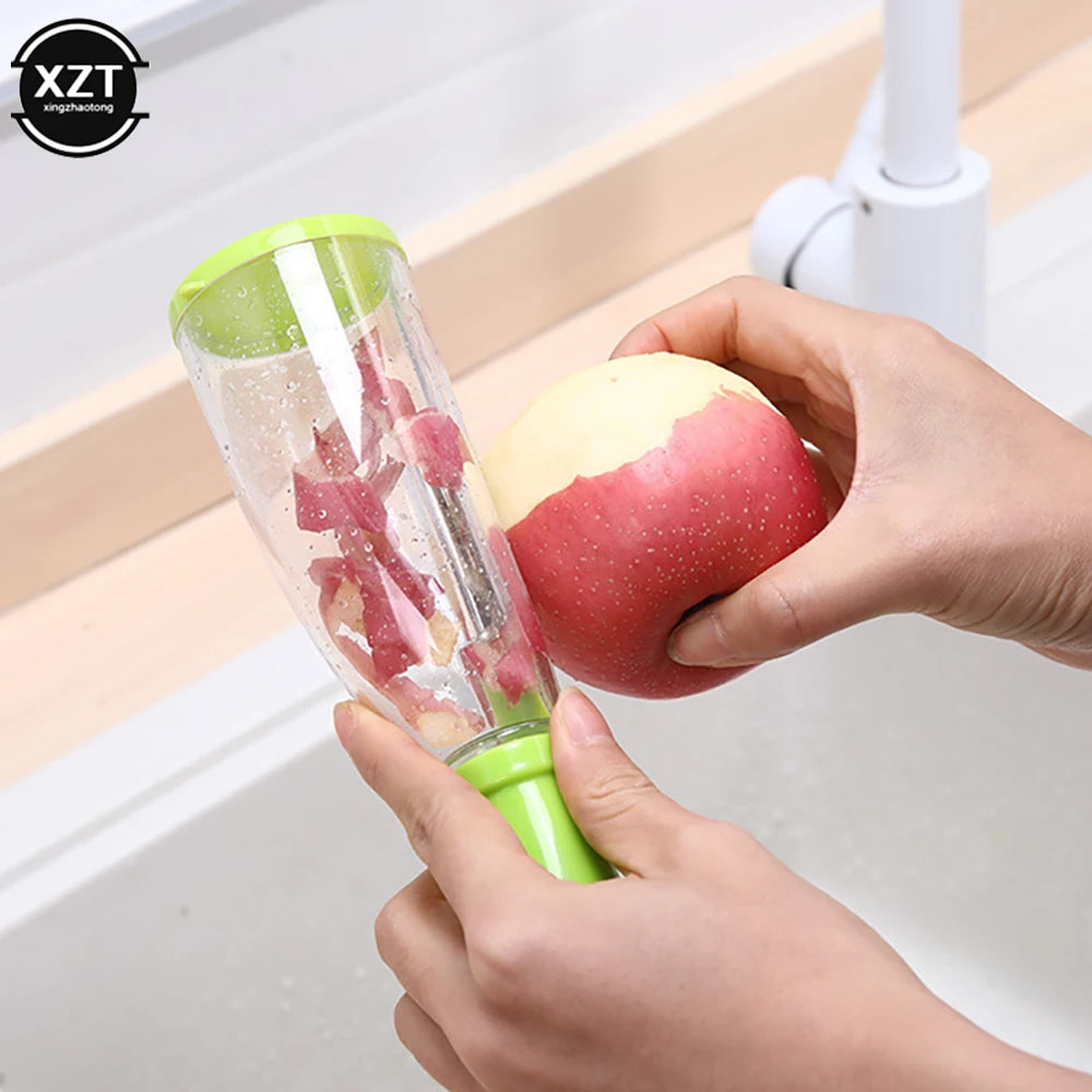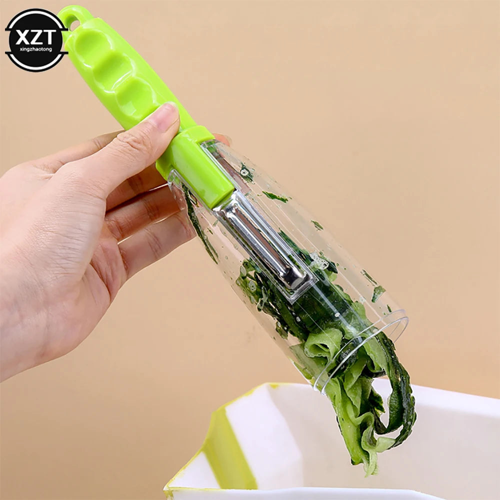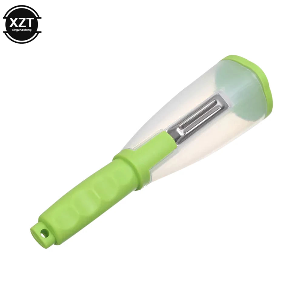Dieses innovative Küchenwerkzeug kombiniert Messer und Schäler mit integriertem Aufbewahrungsbehälter für Gemüse- und Obstschalen. Mit einer scharfen Edelstahlklinge ermöglicht es müheloses und präzises Schälen und Schneiden.