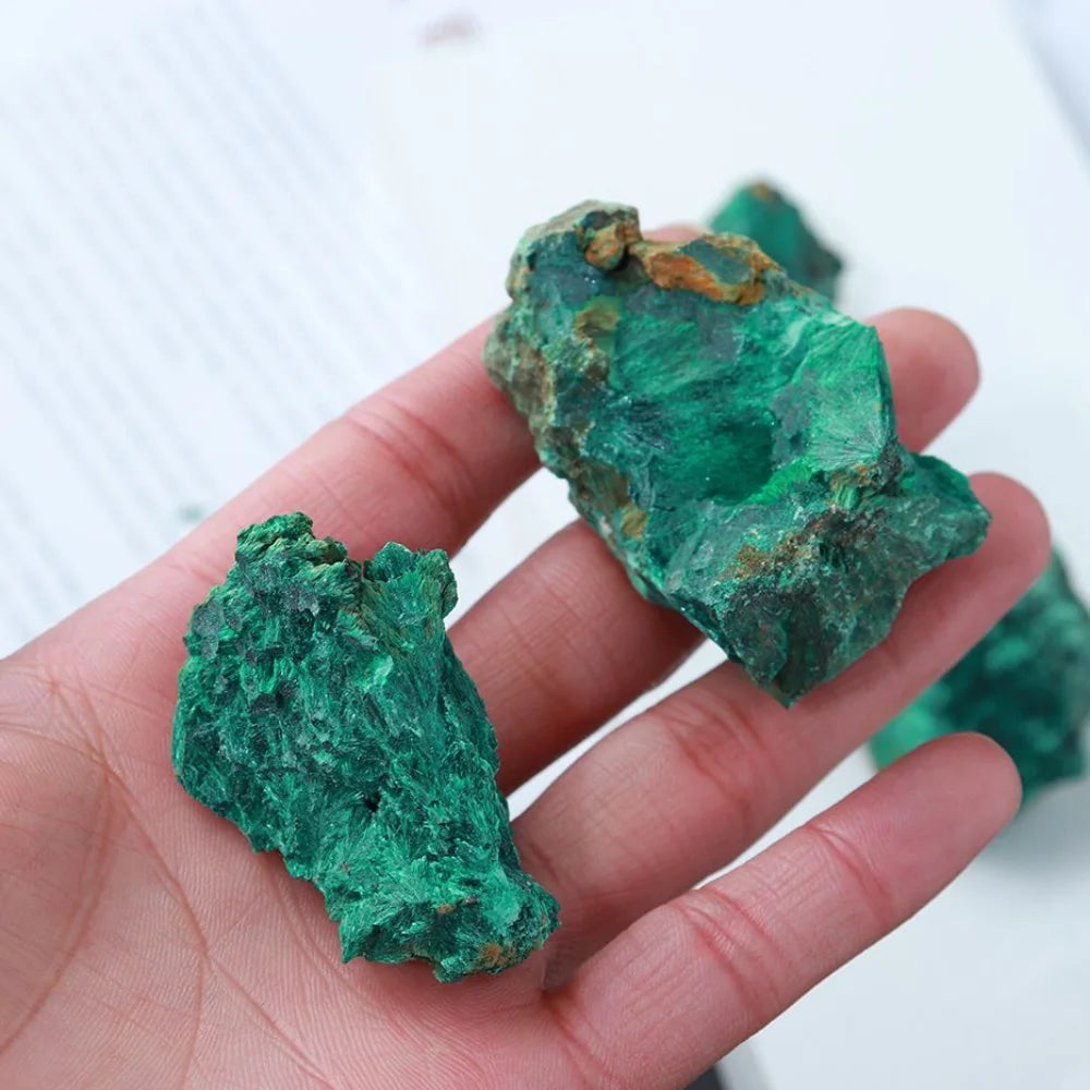 - Maße und Material: Der Stein besteht aus hochwertigem Malachit mit rauer Oberfläche. Größe variiert je nach individueller Auswahl des Rohsteins.