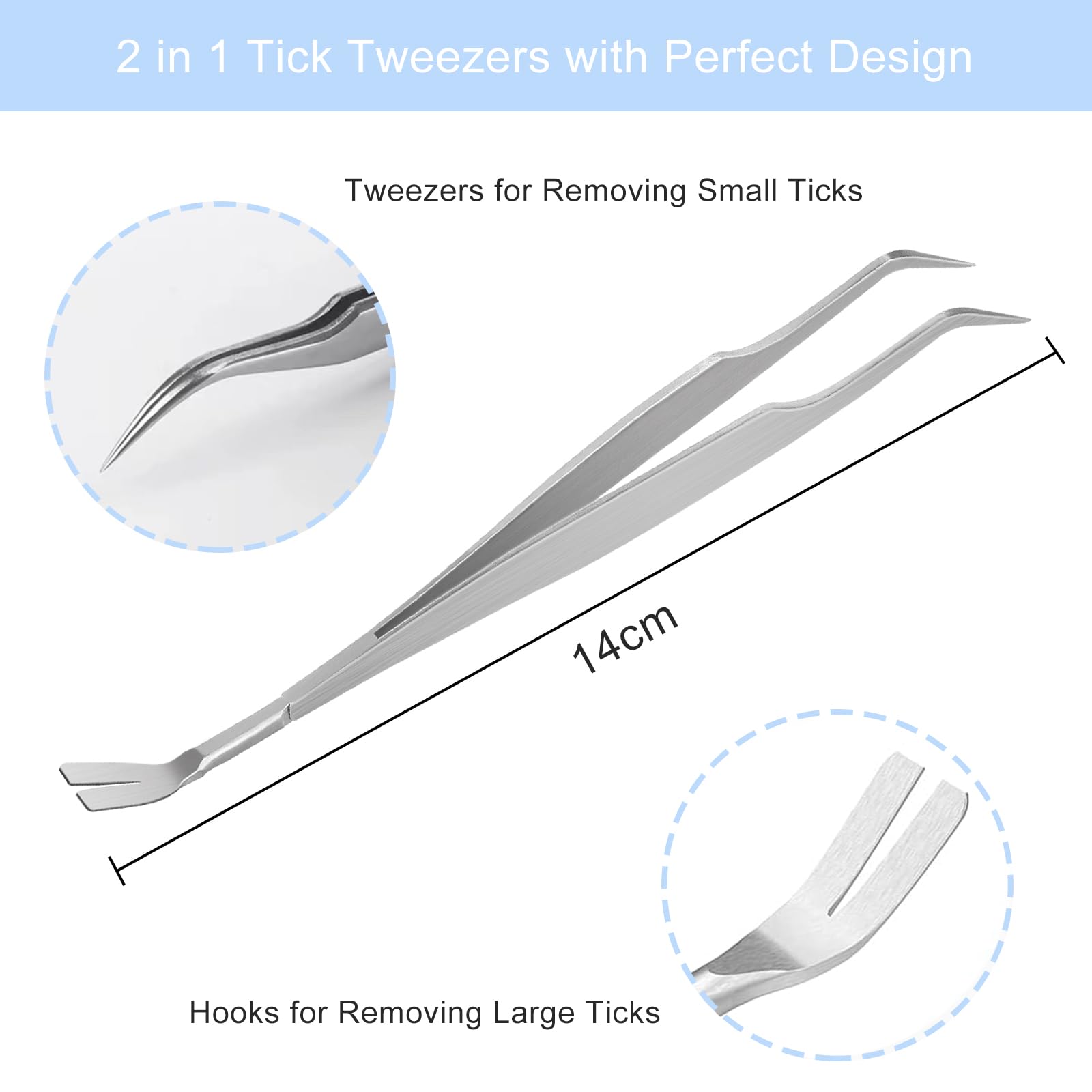 - Design: 2-in-1 Funktion kombiniert Pinzette und Haken – ideal für kleine und größere Zecken.
