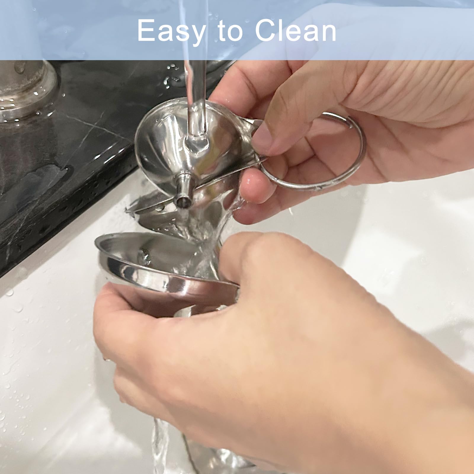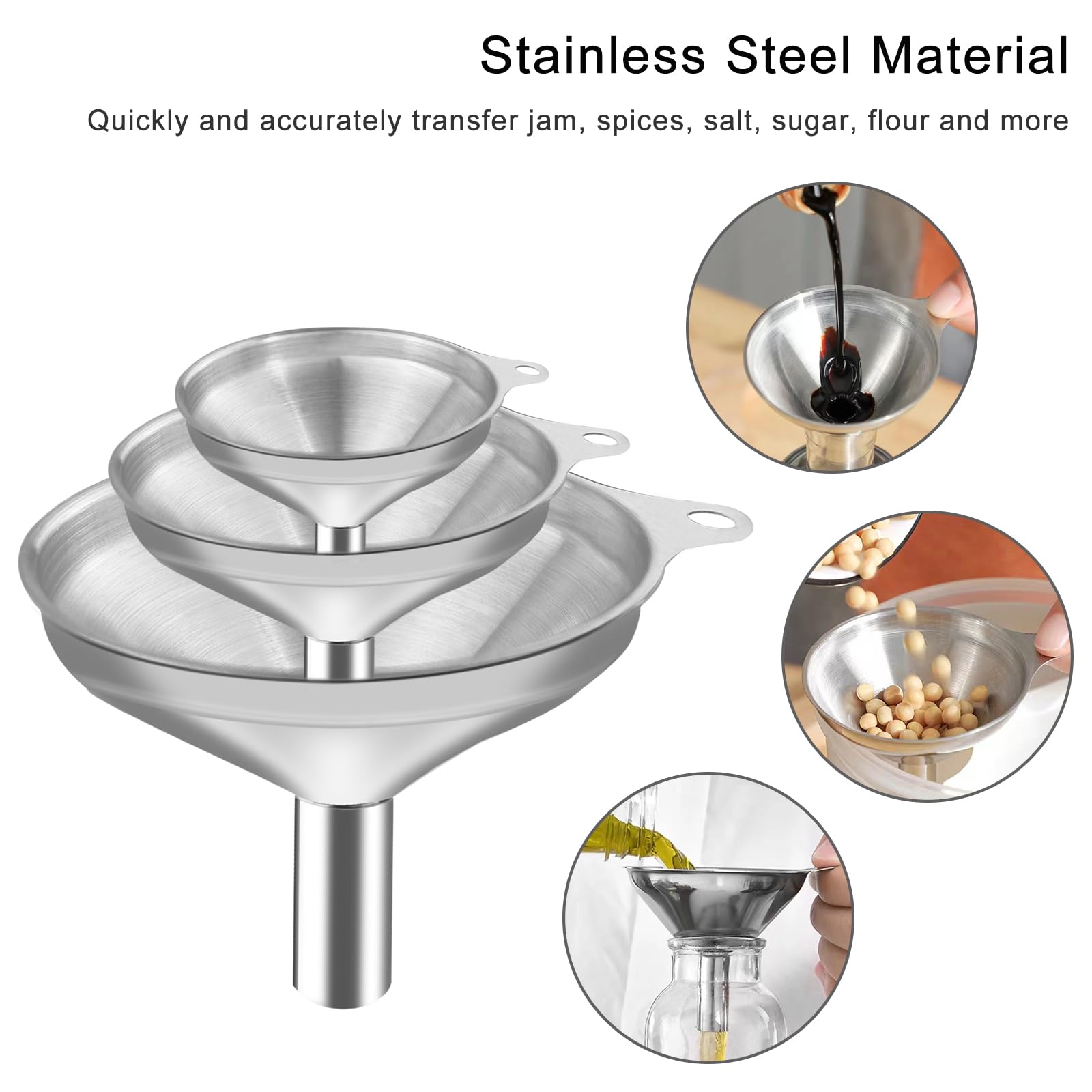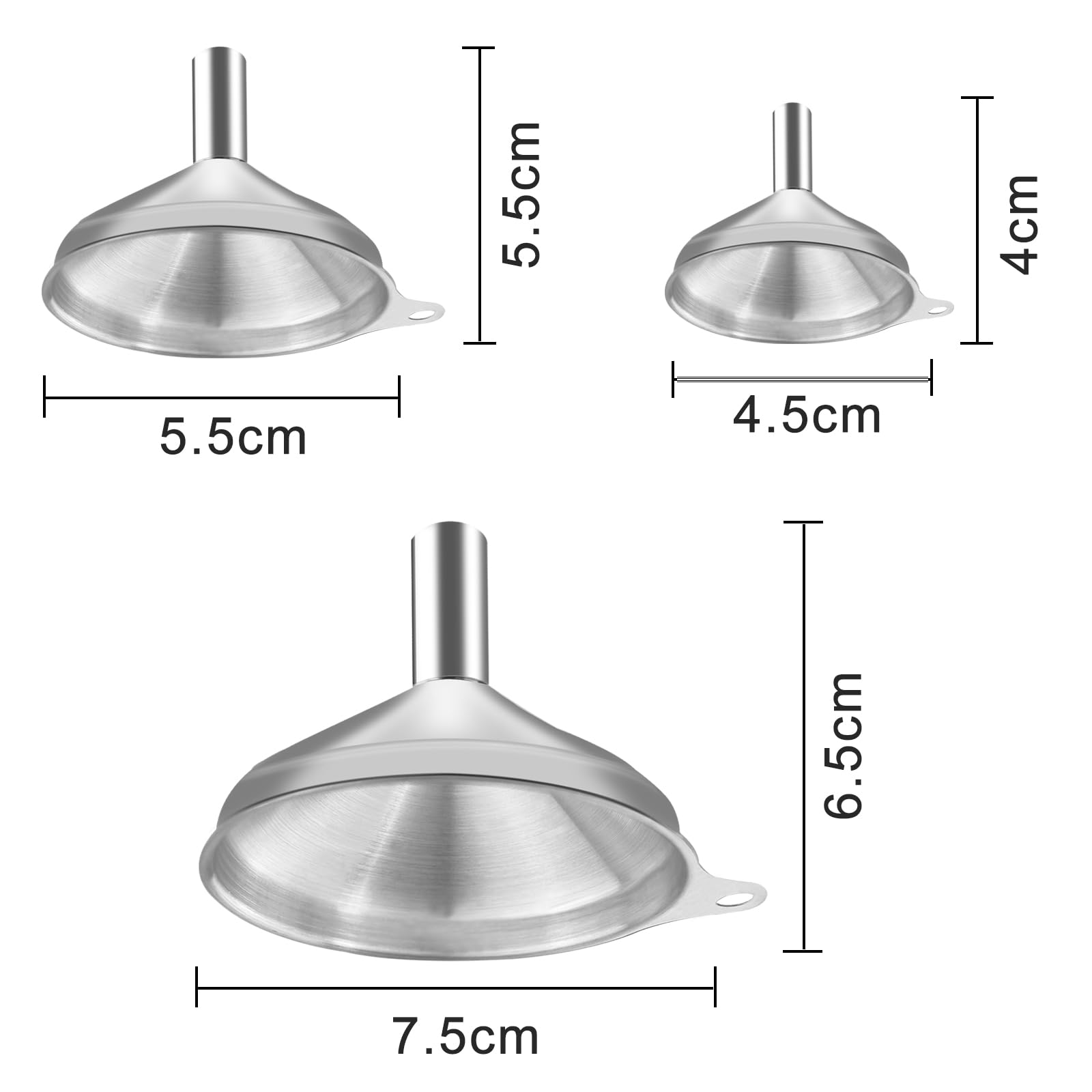 - Maße & Material: Drei Trichter in den Größen groß (7,5 cm Durchmesser), mittel (5,5 cm) und klein (4,5 cm), gefertigt aus hochwertigem lebensmittelechtem Edelstahl, rostfrei, BPA-frei und widerstandsfähig gegen Bruch oder Verformung.