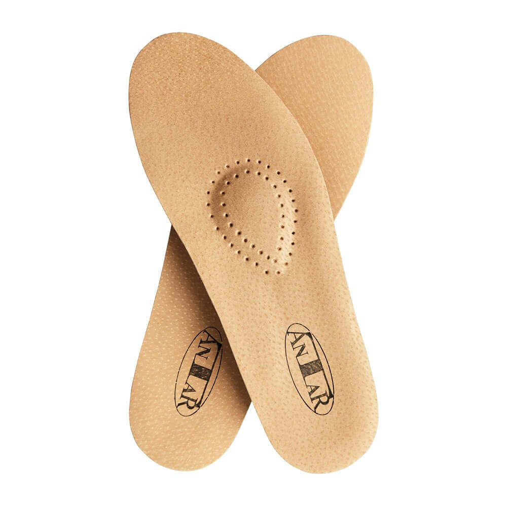 Die AT53502 Ledereinlagen bieten gezielte Unterstützung bei Quer- und Längsplattfuß sowie Valgusstellung von Fersen und Knien. Die integrierte Mittelfußpelotte entlastet den Vorderfuß und beugt Schmerzen durch Spreizfuß oder Hammerzehen vor.