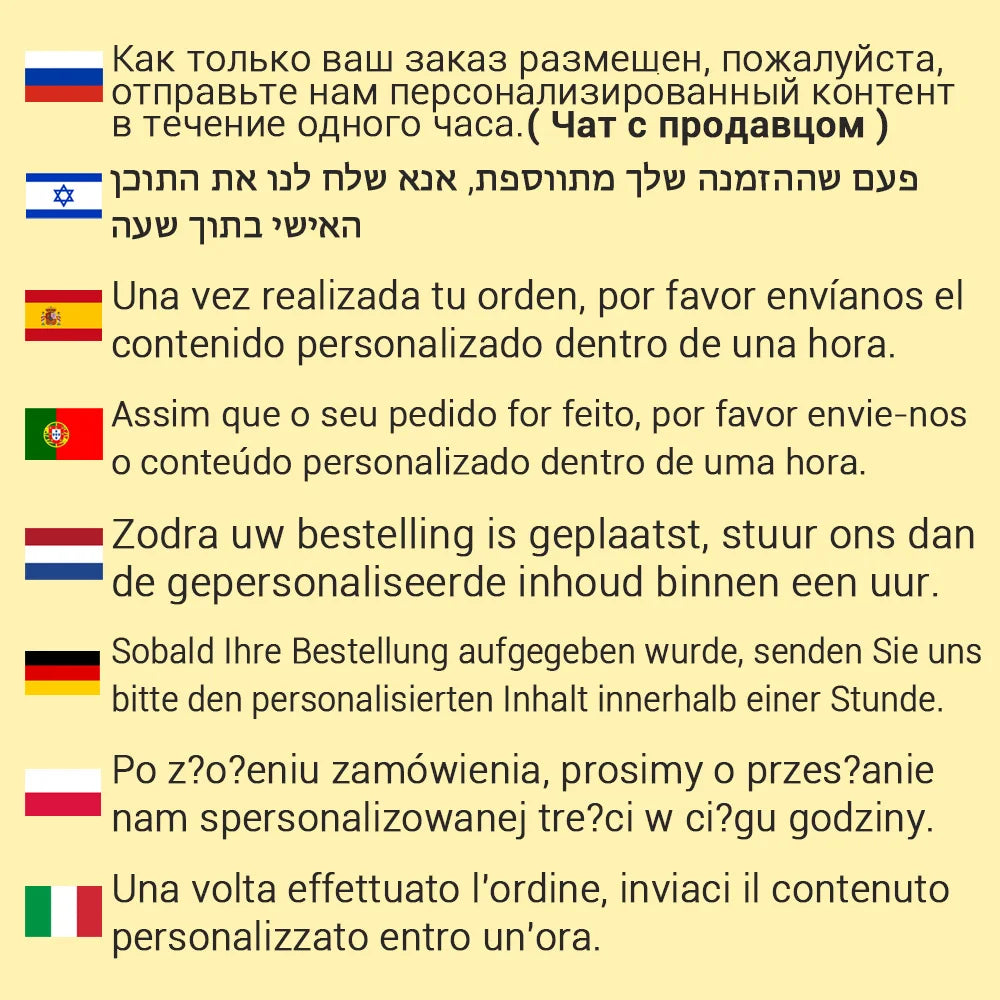 - Anpassung: Bitte personalisierte Inhalte nach Bestellung innerhalb einer Stunde senden