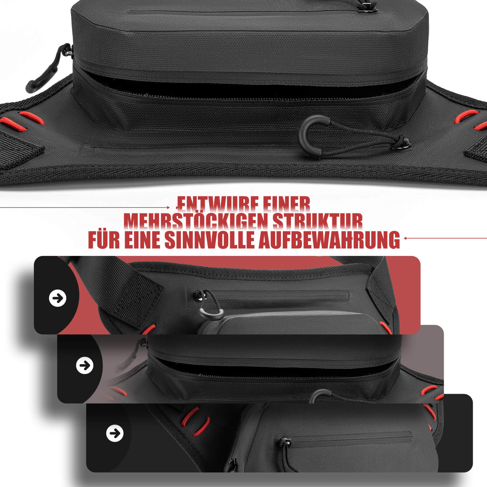 Intelligente Aufbewahrung: Mehrere Reißverschlussfächer ermöglichen eine effiziente Aufteilung und einfachen Zugriff auf Ihre Fahrradausrüstung.