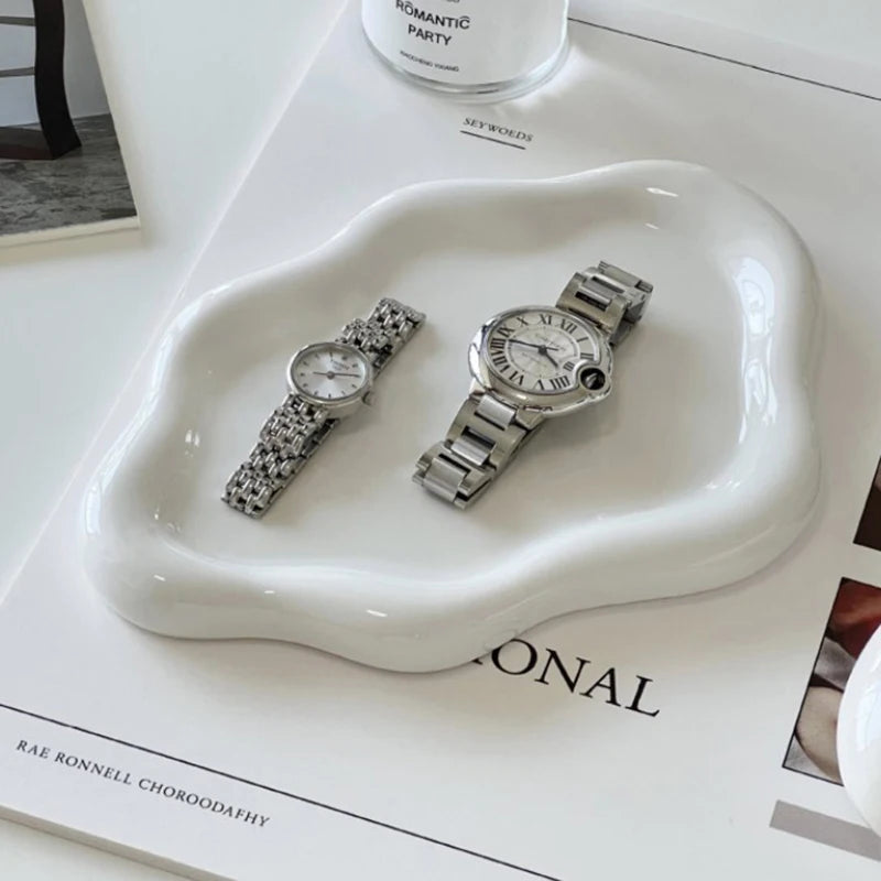 Dieses dekorative Tablett in Wolkenform bietet eine charmante Lösung zur Aufbewahrung Ihrer Schmuckstücke und Schlüssel. Ideal für den Haushalt oder als kreative Dekoration ist es eine ansprechende Ergänzung für jeden Wohnraum. Das Design besticht durch eine Kombination aus Keramikoptik und moderner Funktionalität.