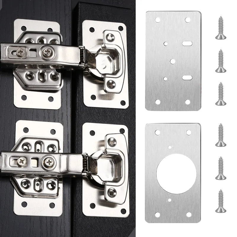 Diese Reparaturplatte aus gebürstetem Edelstahl bietet eine langlebige Lösung für beschädigte Möbel- und Küchenschrank-Scharniere. Das einteilige, dickere Design sorgt für höhere Tragfähigkeit und Stabilität bei verschiedensten Anwendungen im Heimwerkerbereich.
