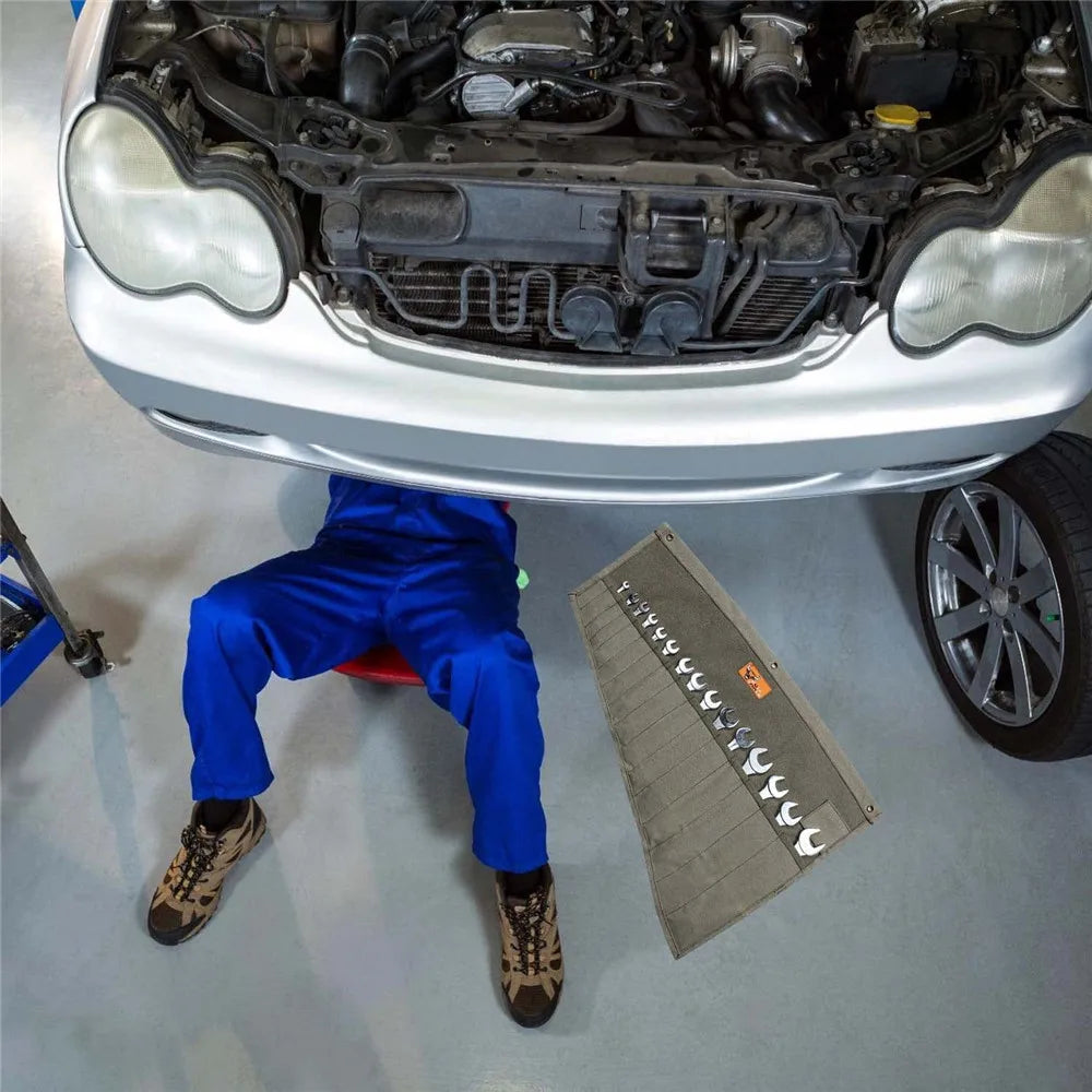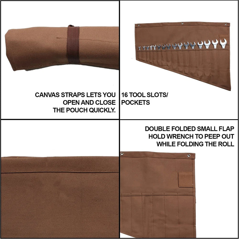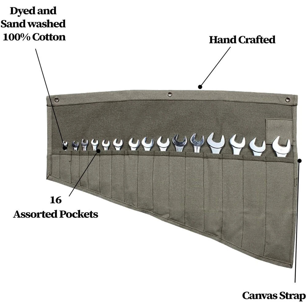 Diese robuste Werkzeugrolltasche aus 16 Unzen Oxford-Gewebe ist ideal für Elektriker und Handwerker. Mit 14 praktischen Taschen bietet sie vielseitigen Stauraum für Schraubenschlüssel und weiteres Werkzeug, um alles ordentlich und griffbereit zu halten.